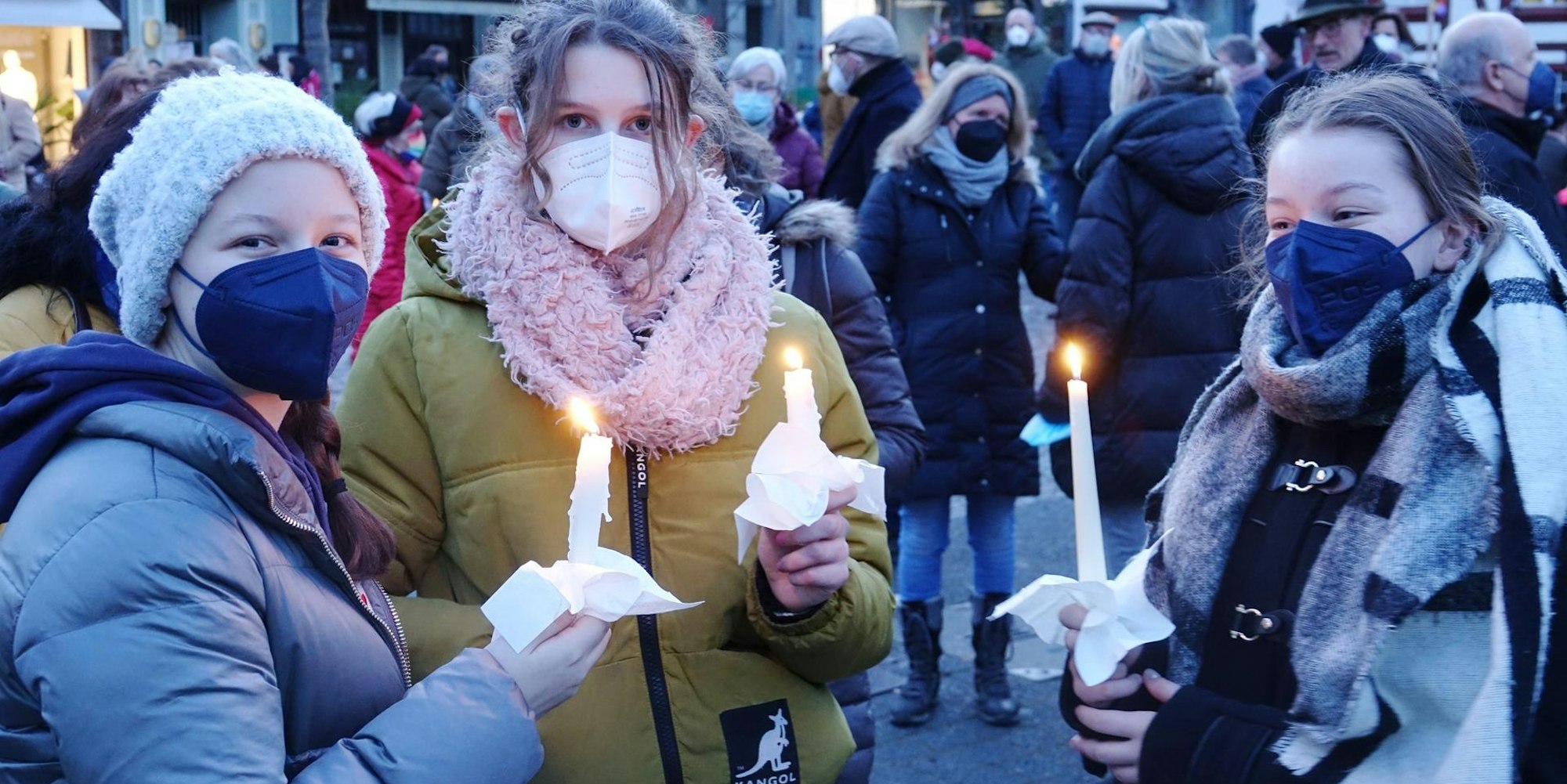 Kerzen entzündeten Amira (v.l.), Paulina und Lea, Schülerinnen des Emil-Fischer-Gymnasiums, für die Menschen in der Ukraine.