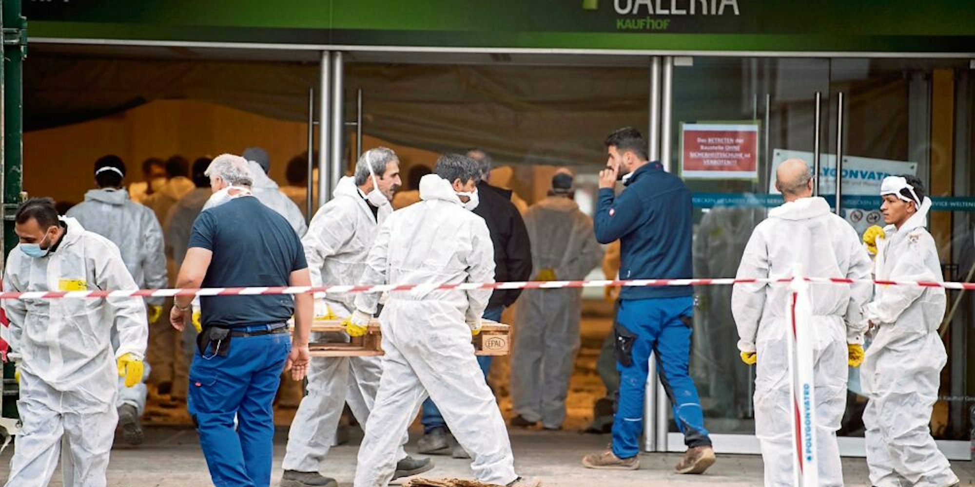 Die Aufräumarbeiten im Kaufhof laufen auf Hochtouren.