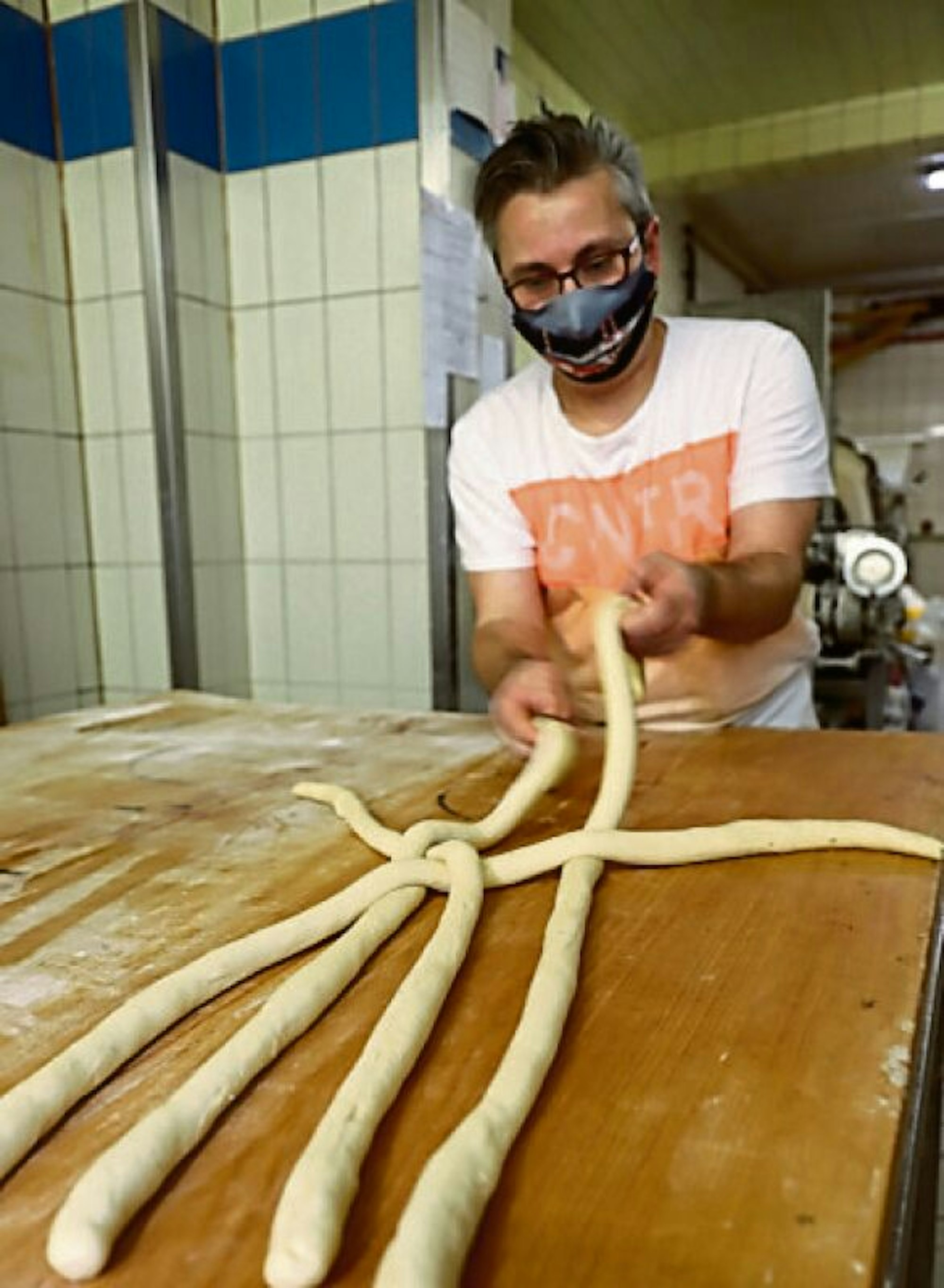 Die Stränge dürften nicht trocken werden, sonst ließen sie sich nicht mehr verarbeiten, erläutert Bäckermeister Peter Milz: „Am besten ist es, wenn gleichzeitig Brot gebacken wird, weil dann die richtige Feuchtigkeit herrscht.“