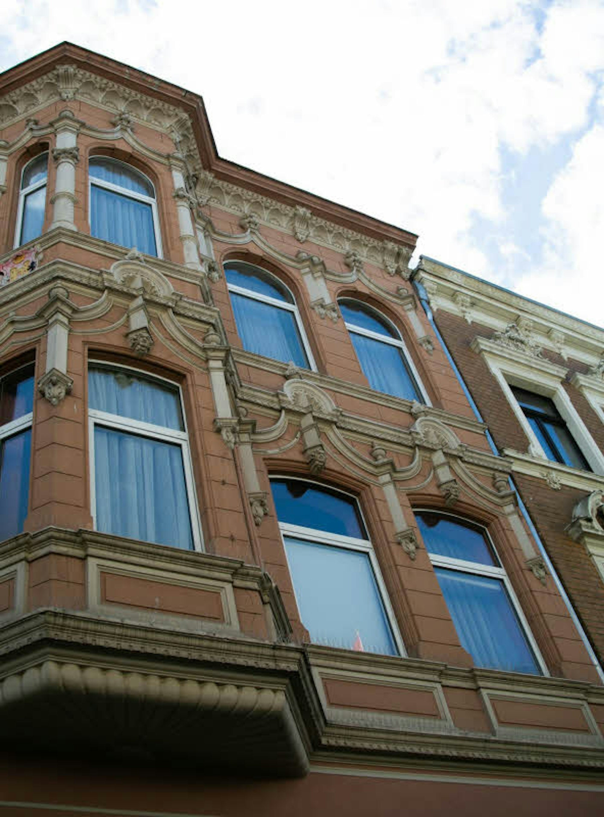 Auf der Wilhelmstraße weist Baumerich auf eines der Drei-Fenster-Häuser hin. Diese schmale Bauweise war typisch für das Rheinland. Denn zu Beginn des 20. Jahrhunderts habe es eine Steuer bezüglich der Breite der Häuser gegeben, so der Experte. Wer sich aber gut mit seinem Nachbarn verstand, sprach sich in der Gestaltung der Fassade mit diesem ab. So wirkten zwei schmale Häuser auf den ersten Blick wie ein großes breites, erklärt der Experte lächelnd und führt die Gruppe von Haus zu Haus.