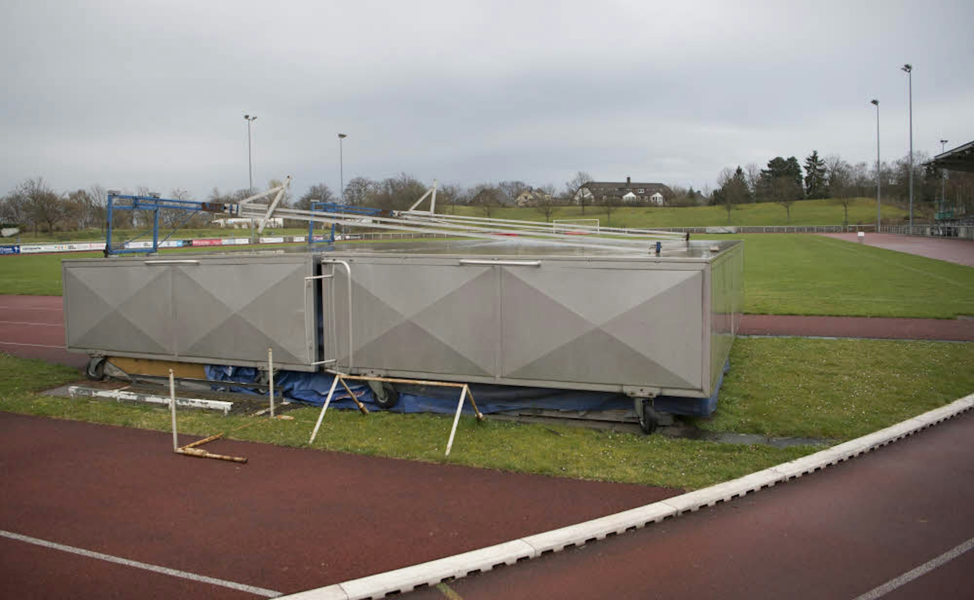 Die Stabhochsprunganlage im Erftstadion ist defekt. Unter anderem passen die Hüllen nicht mehr auf die Matten.