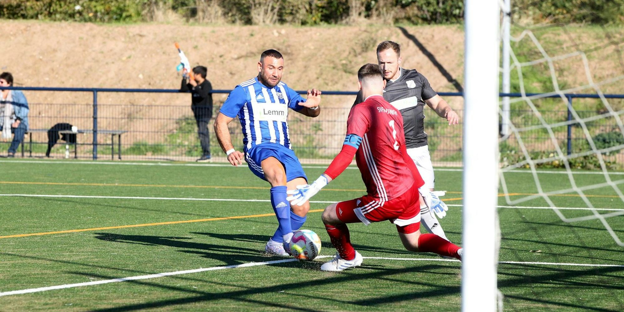 Das Schiedsrichter-Gespann mit Referee Fabian Wolffs und seinen jungen Assistenten Jamal Stropolo und Dennis Olschewski verdient ein Sonderlob. Sie leiteten ein hitziges und teils unruhiges Derby souverän und nachvollziehbar. Eine Rote Karte verteilte Wolffs auch: An einen Zuschauer, der den Innenraum daraufhin verlassen musste.