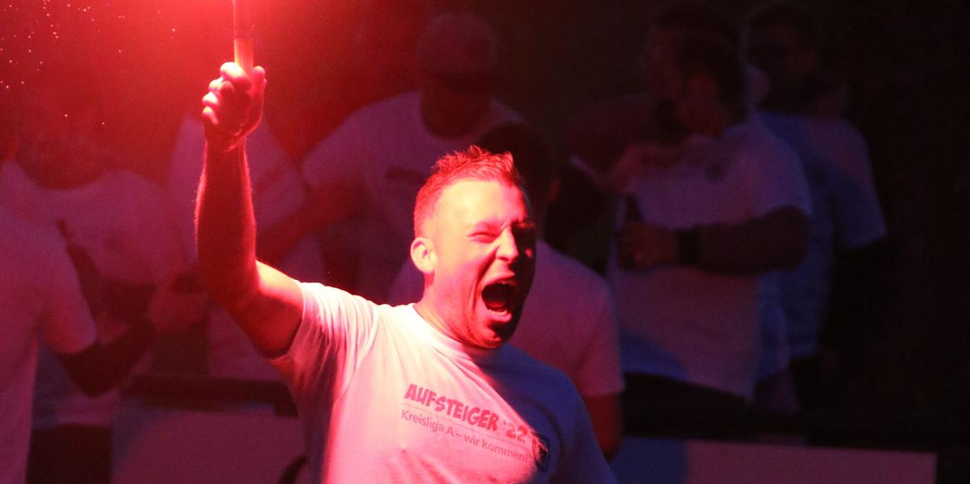 Einige Dreiborner Spieler, hier Marek Welter, tauchten den Rinnener Sportplatz in grellrotes Licht von Bengalofackeln.