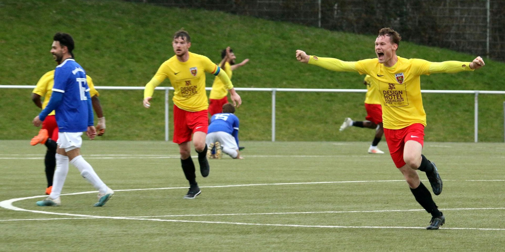 Riesenjubel herrschte beim ETSC: Max Hilgers (r.) und seine Mitspieler freuten sich über den ersten Sieg.