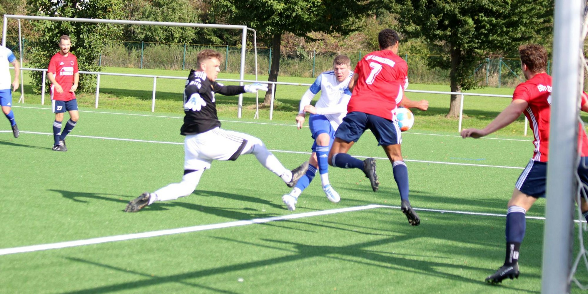 Gleich zweimal sorgten Handspiele für erhitzte Gemüter. In der 35. Minute war Lommersums Torwart Leon Wynen schon geschlagen, als der Ball Joshua Schramm trifft – halb am Bauch, halb am ausgefahrenen Unterarm. Es gab schon für weniger Elfmeter.