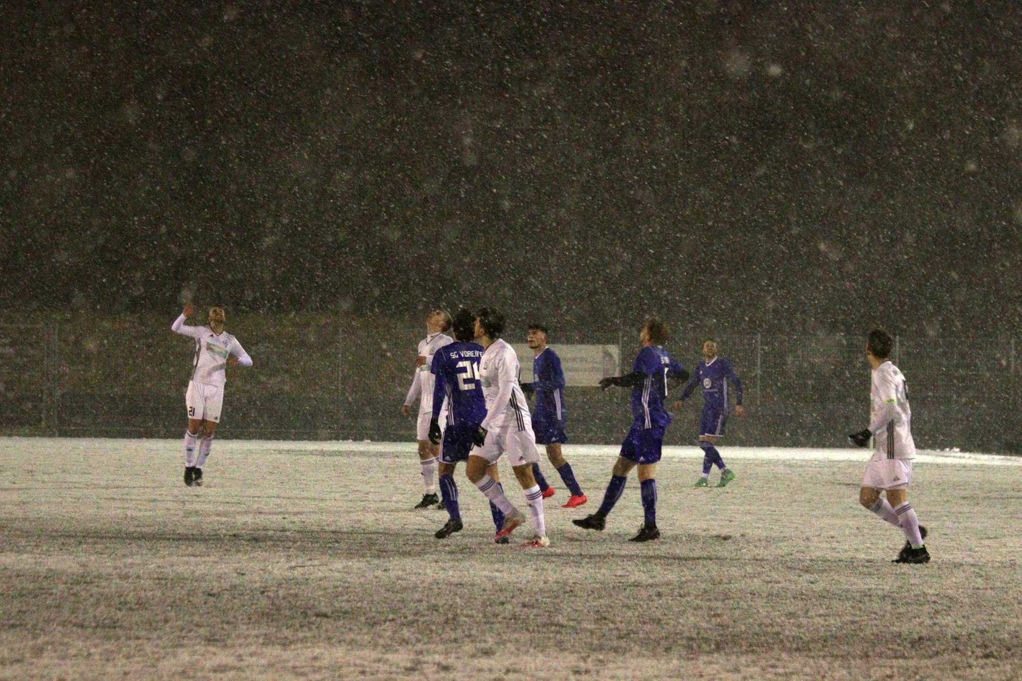 Nettersheim – SV Nierfeld – SG Voreifel abbr. (1:1). Der Halbzeitpfiff war am Donnerstagabend im Nettersheimer Schneegestöber auch der letzte Pfiff von Schiedsrichter Luca Povoledo. Zwar bat der Referee die Teams nach der Halbzeitpause noch kurz auf den Platz – aber nach Rücksprache mit seinen Assistenten Lukas Feist und Nick Wild und den beiden Mannschaften brach er das Spiel ab.