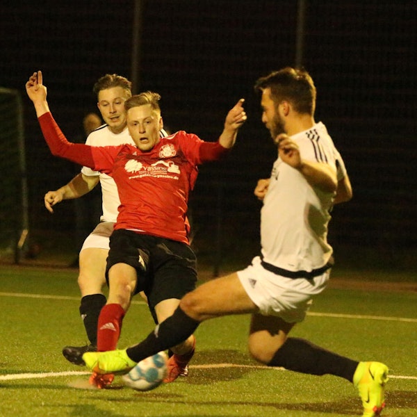 Die Gastgeber hatten danach große Mühe, Struktur in ihre Offensivaktionen zu bekommen und verloren phasenweise schnell den gerade gewonnenen Ball. Erst spät im ersten Abschnitt gelang der sehenswerte Ausgleich, als Thomas Leßenich lang und diagonal auf Dustin Oellers passte, der Kapitän per Kopf querlegte und David Sasse aus kurzer Entfernung vollstreckte (36.). Ein noch leicht abgefälschter Schuss von Leßenich ans Aluminium hätte mit dem Pausenpfiff beinahe sogar für das 2:1 gesorgt.