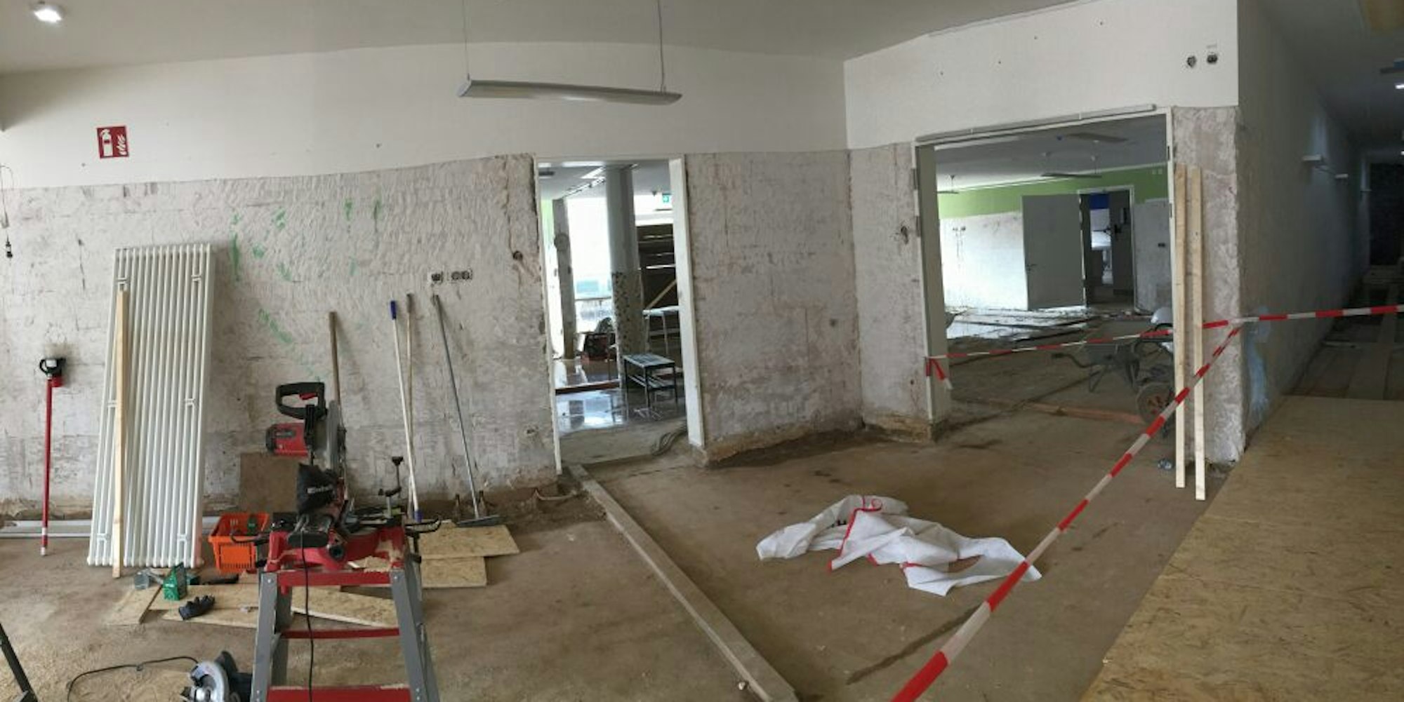 Das Erdgeschoss des Seniorenpflegeheims, das vollständig überflutet worden war, wird entkernt, anschließend getrocknet und saniert.
