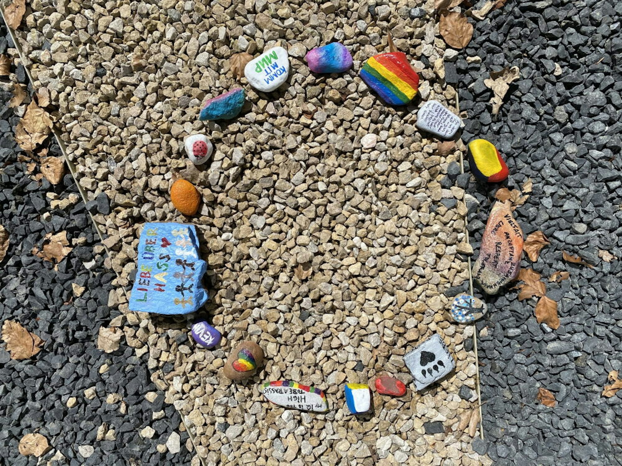 Rund 400 Steine sind bereits gesammelt worden, alle mit unterschiedlicher Gestaltung und Botschaft: Sowohl regenbogenfarbene Herzen, allerlei Friedenssymbole, Mandalas und Blumenranken als auch bunte Weltkugeln, sich reichenden Hände und lachende Gesichter finden sich darauf. Auf manchen der Steine stehen ganze Gedichte, andere sind mit passenden Schlagwörtern verziert oder mit mal ernsten, mal witzigen Sprüchen wie „Mein IQ ist zu hoch für Rassismus“ oder „Liebe über Hass“.