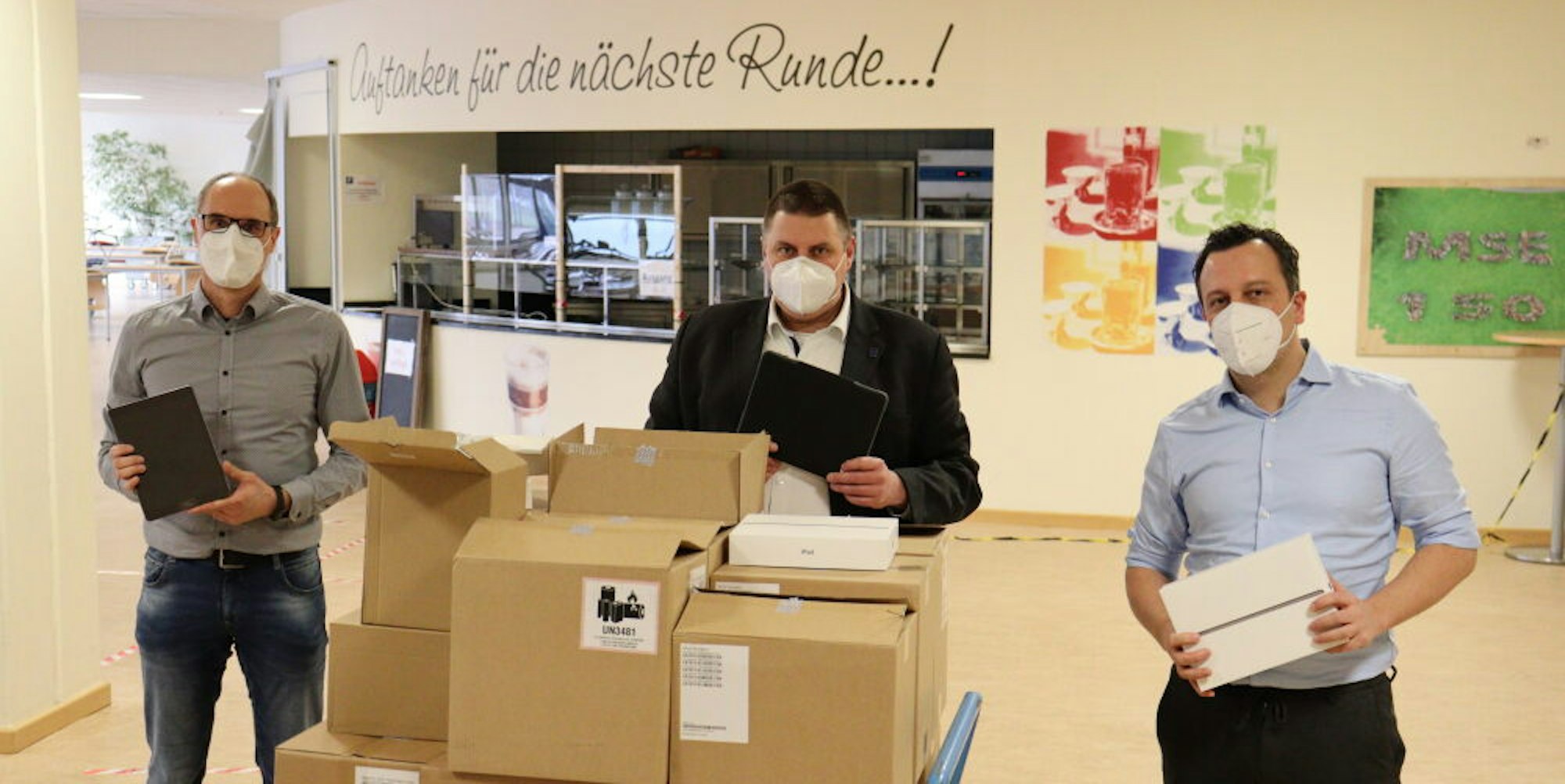 An der Marienschule packten der Informatiklehrer Benjamin Schnicke (v. l.) und Schulleiter Michael Mombaur im Beisein von Bürgermeister Sacha Reichelt die ersten Tablets aus.