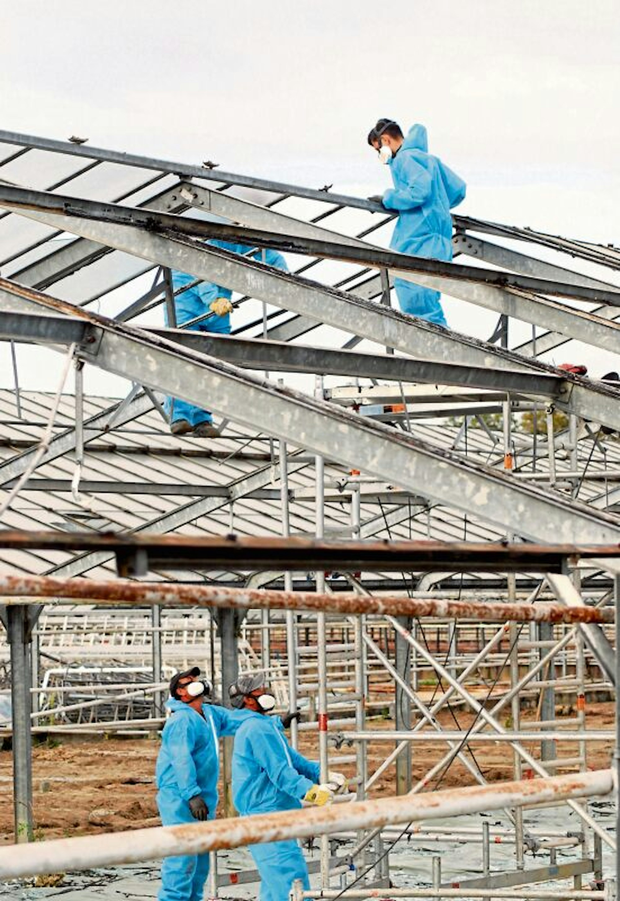 Weil der Fensterkitt Asbest enthält, tragen die Männer Schutzkleidung, Handschuhe und Atemmasken. Sie trennen den Kitt mit einem oszillierenden Messer von den Rahmen, sodass er auf Folie fällt, die auf dem Boden ausgebreitet ist, sagt Nagel: „Alles zusammen kommt zum Abtransport in Asbest-Säcke.“ Schon vorher waren Blumentische mit asbestzementhaltigen Einlegeplatten aus den Gewächshäusern geholt worden.