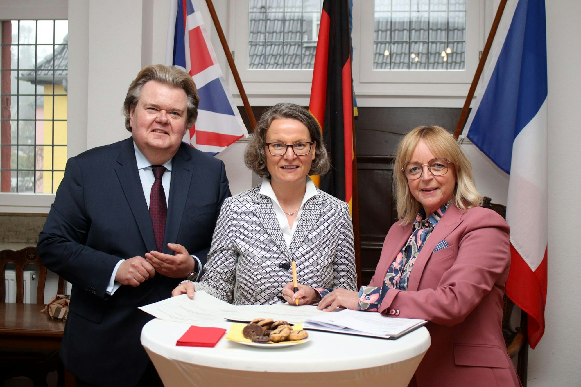 Mit Freude unterzeichnete Sabine Preiser-Marian (r.) den von Ina Scharrenbach (links: Klaus Voussem) überreichten Förderbescheid.