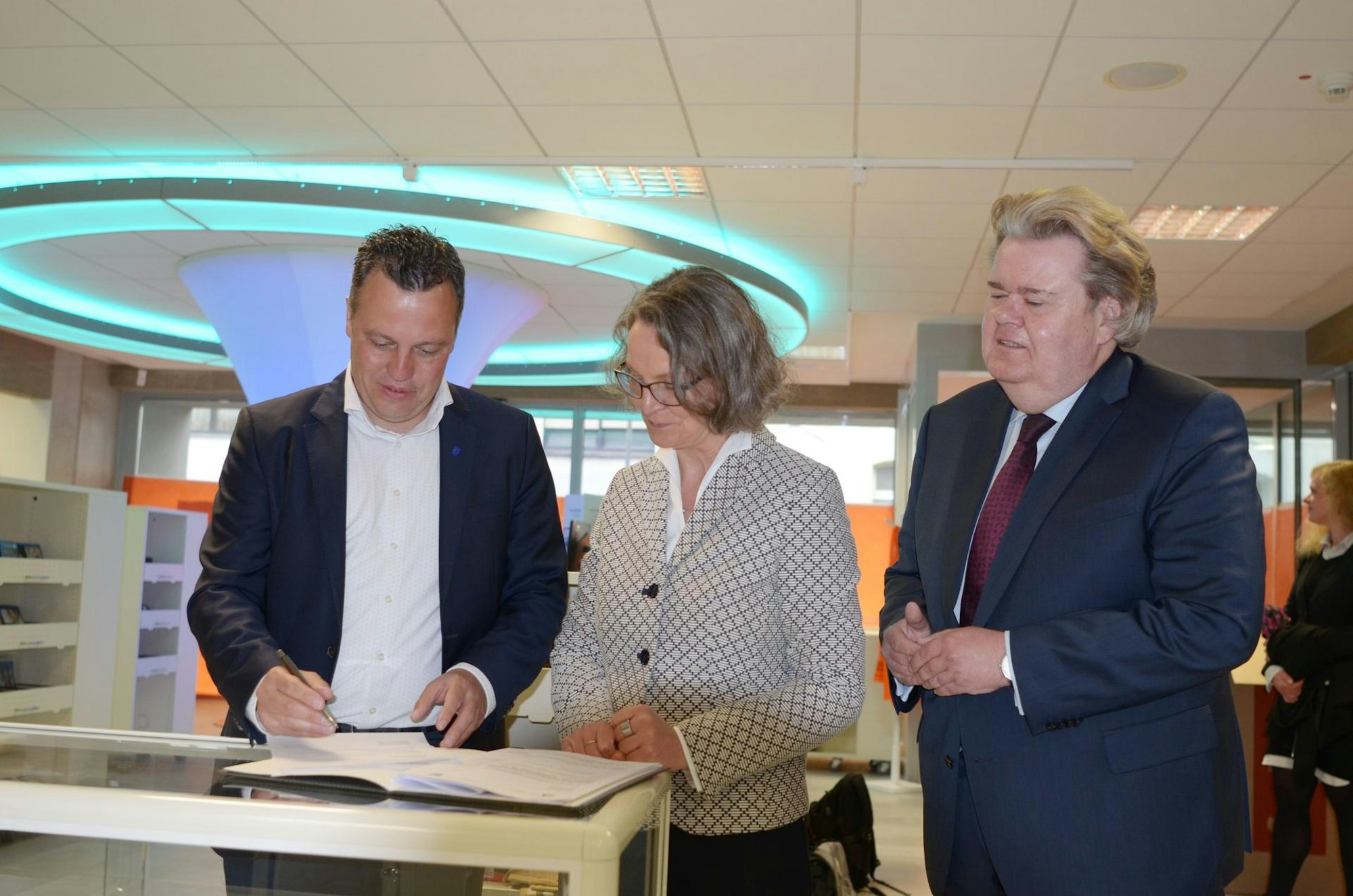 In der Stadtbibliothek Euskirchen unterschrieben Sacha Reichelt und Ina Scharrenbach die Vereinbarung über die Förderung.