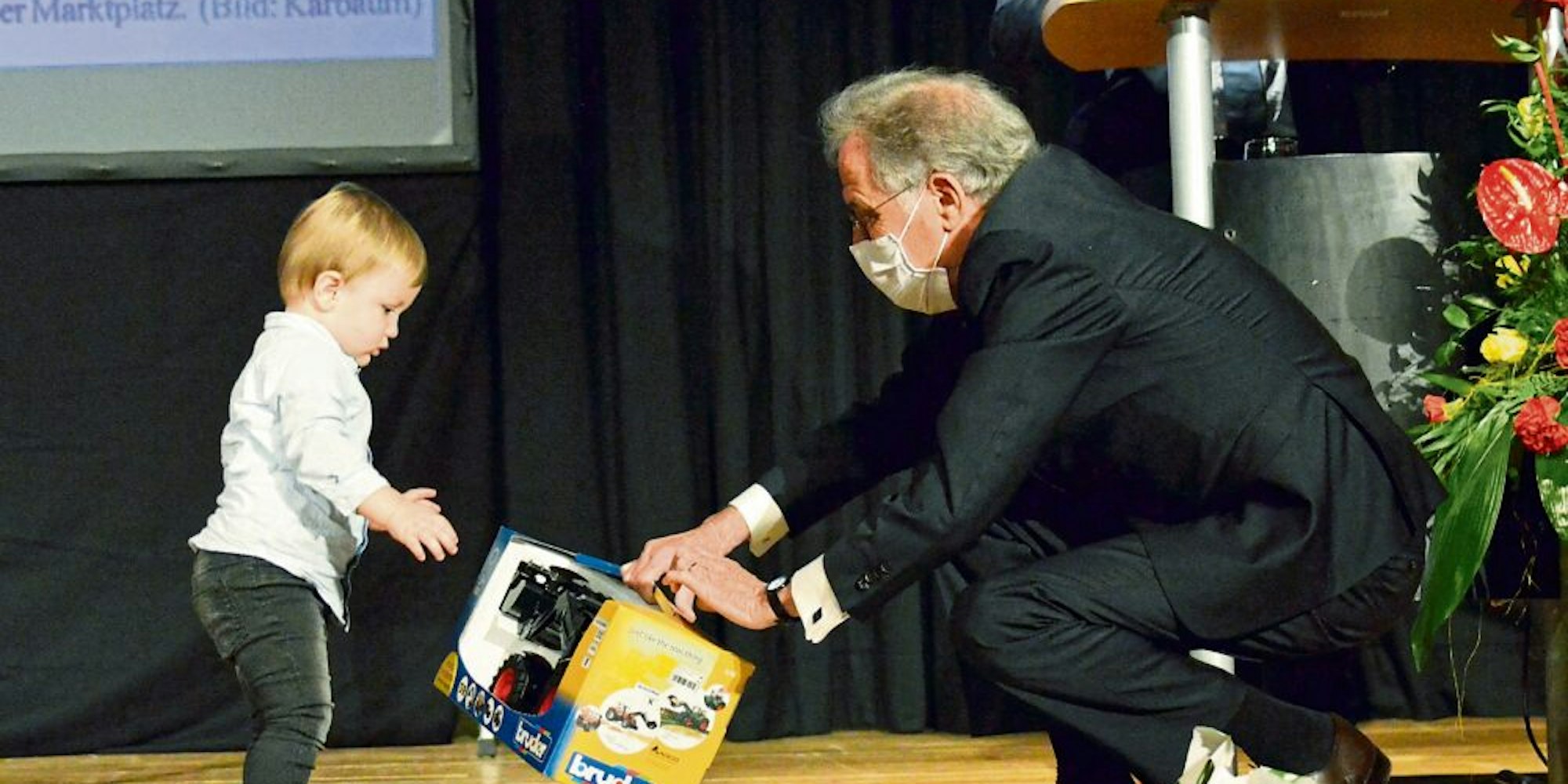 Schick hob auch Friedls Zielstrebigkeit hervor, sein Verhandlungsgeschick, ebenso seinen Familiensinn: „Bei aller faktisch-rationalen Rede und Handlung bleibt bei dir vor allem die Menschlichkeit nicht auf der Strecke.“ Dafür gebühre ihm die Achtung seiner Amtskollegen, sagte der Mechernicher, bevor er Friedl als Geschenk unter anderem einen großen Spielzeug-Traktor überreichte. Er war aber nicht etwa für den 65-Jährigen gedacht, sondern für dessen Enkel Fritz, den Friedl zum Auspacken gleich auf die Bühne holte.