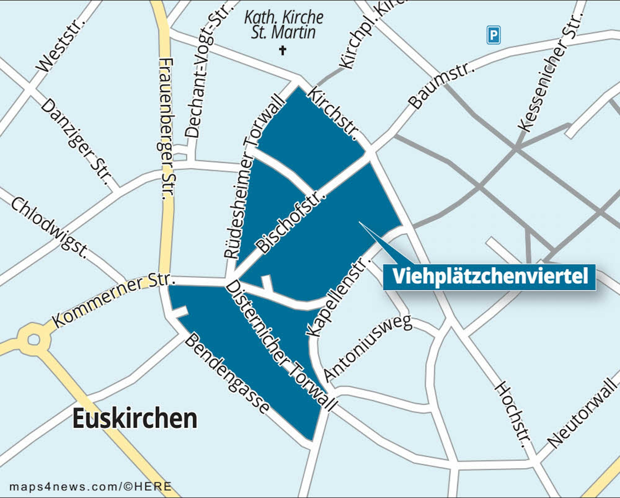 „Am Viehplätzchen gibt es Straftaten, aber nicht im öffentlichen Raum“, sagt der Euskirchener Polizei-Pressesprecher Franz Küpper. Hinter den Fassaden würden vor allem „Drogengeschäfte und andere Straftaten im halbseidenen Bereich“ abgewickelt.