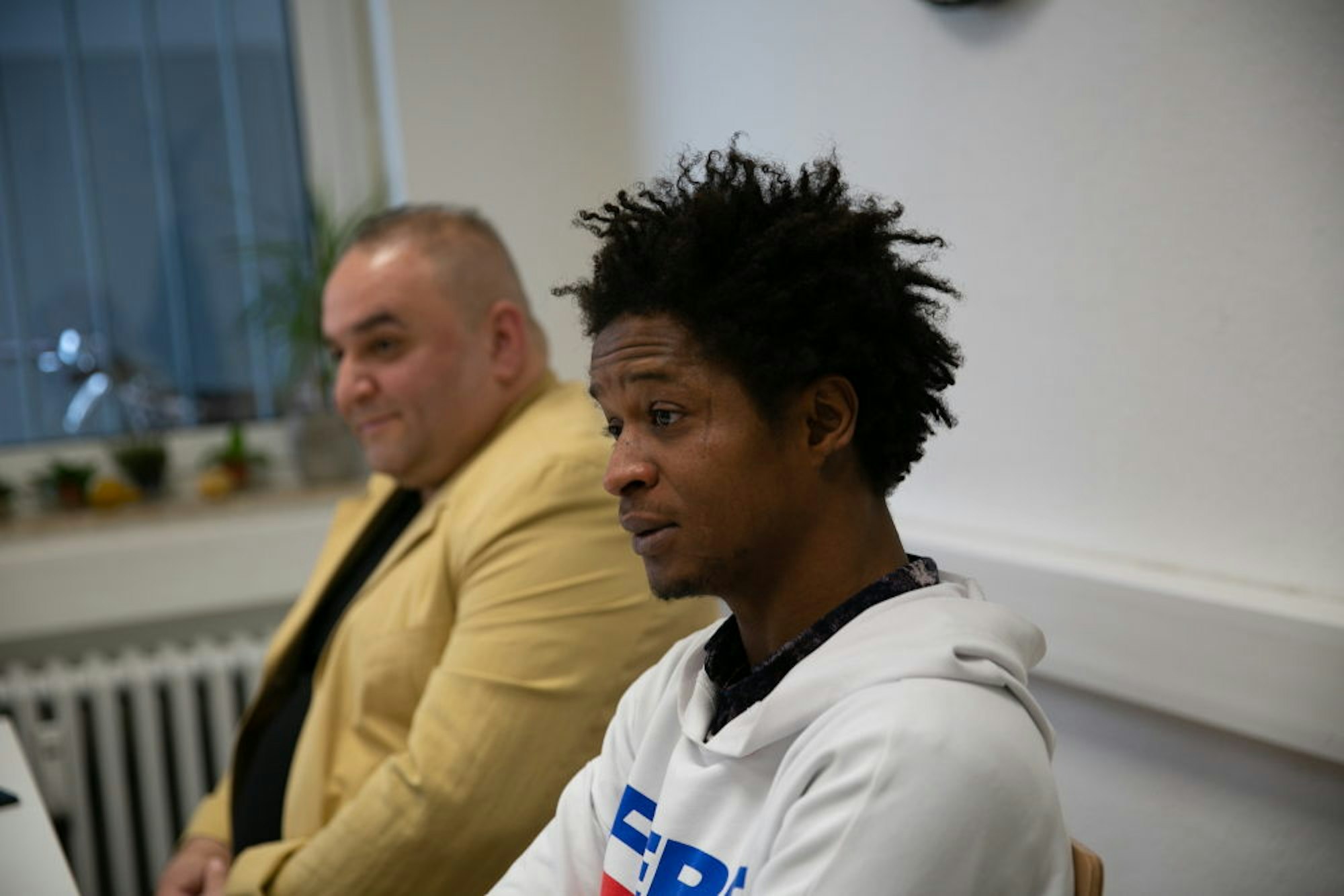 Sprechen über Weihnachten: Berufsmusiker Fadi Al Khoury (hinten) und Abdoulghoudoussy Diallo.