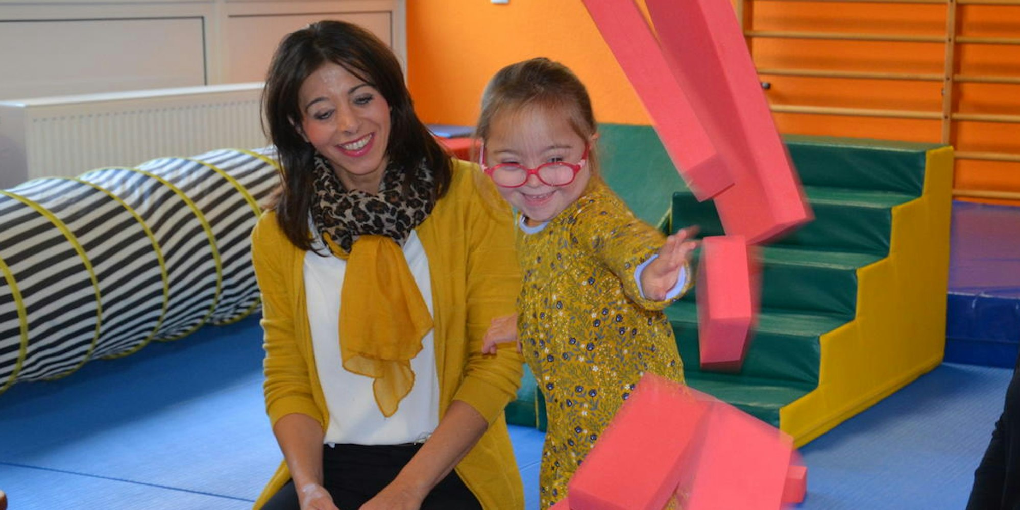 Vor ihr auf dem Boden sitzt Helene, die gerade Plastik-Pommes auf einen Teller legt und Fantasie-Kaffee in kleine rote Tassen gießt. Das begeisterte Spiel der Viereinhalbjährigen mit der Puppenküche ist Teil der Frühförderung, zu der Carina Hatzenbühler ihre Tochter seit einigen Jahren in die Therapieräume der Lebenshilfe Kreisvereinigung Euskirchen bringt. Betreut wird das Mädchen von Heilpädagogin Michaele Schwaab: „Kinder mit Down Syndrom zeigen mehr Unterschiede als Gemeinsamkeiten. Jedes Kind hat ganz individuelle Züge.“ Helene sei sehr aufgeweckt, könne sich gut konzentrieren und an Regeln halten, gehe in Kommunikation und habe tolle Spielideen, so die Heilpädagogin. Ihr Entwicklungsalter entspreche in etwa dem einer Dreijährigen.