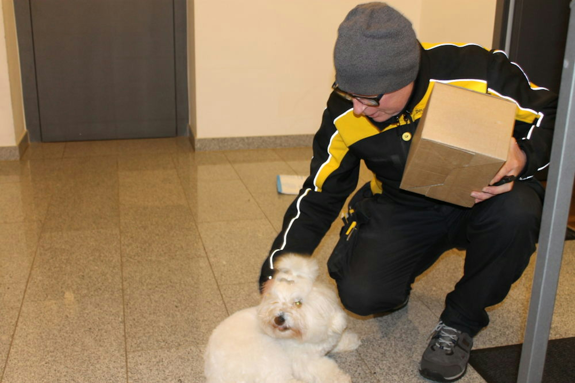 Mayla hat den Postbediensteten schon sehnlichst erwartet. Die weiße Hündin mit den kurzen Beinchen stürmt aus der Wohnungstür Richtung Treppe. Steffen bückt sich zu ihr runter, streichelt sie hastig und zückt ein Leckerli. Maylas Besitzerin, noch im Schlafanzug, lächelt: „Mayla findet alle Paketboten toll“, erzählt sie.