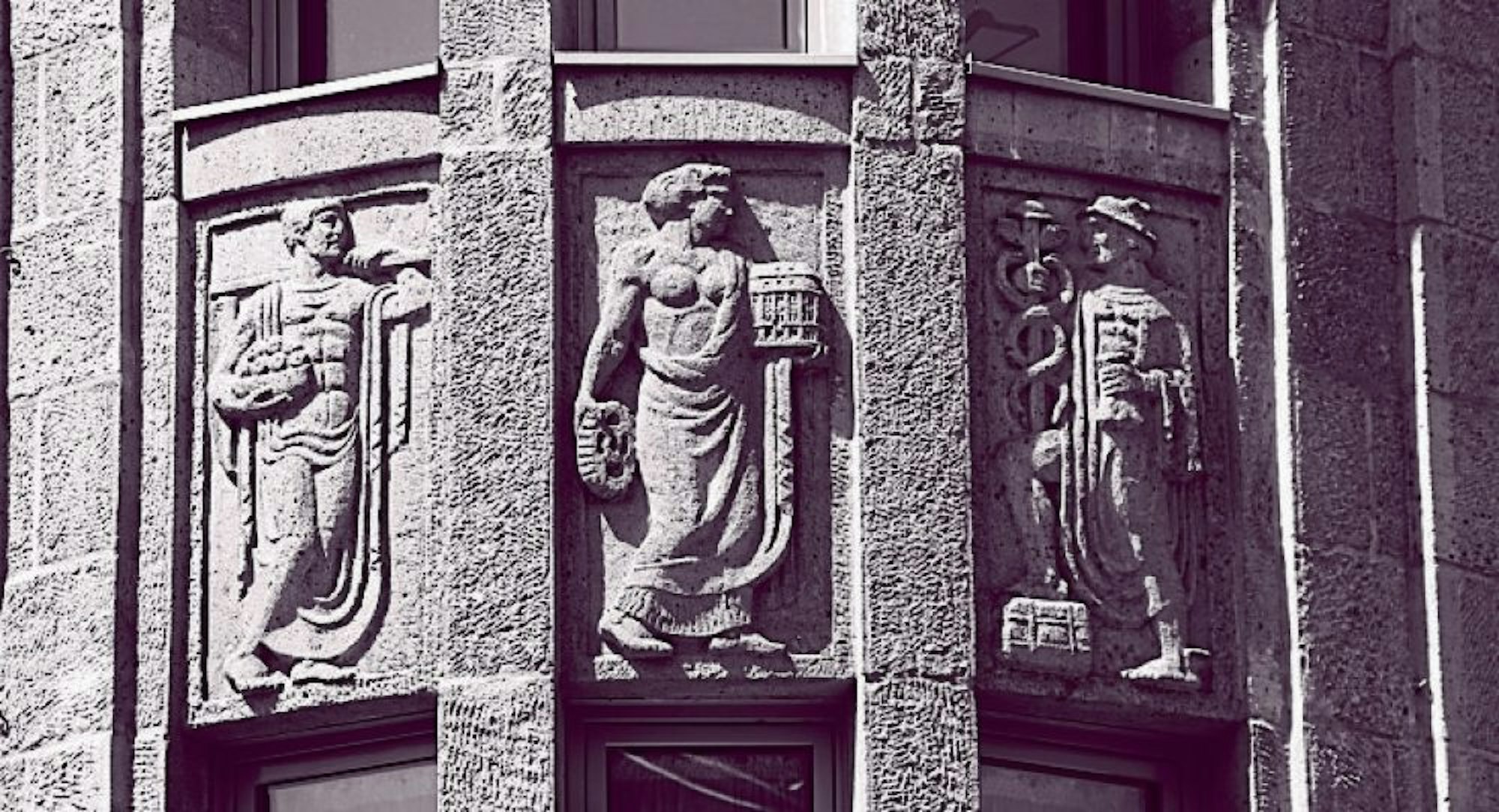 Drei Götter erzählen vom Grund des Wohlstands der ursprünglichen Eigentümer dieses Geschäftshauses.