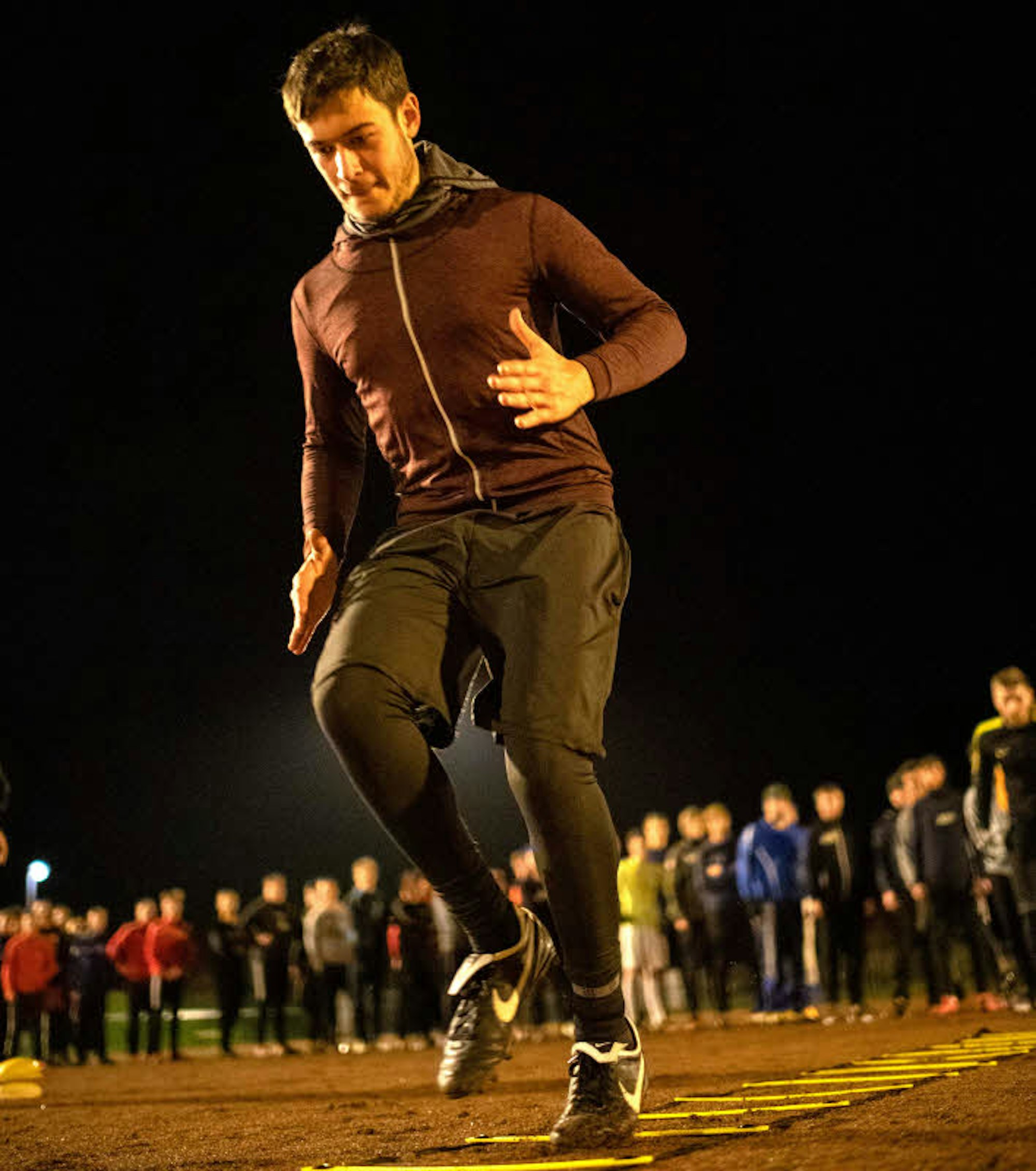 Alles andere als gewöhnlich ist der Blick, mit dem der Trainer seinen potenziellen Spielern hinterherschaut, wenn die mal eine Hürde reißen oder nur mit 90 Prozent eine Übung machen. „Wenn er so guckt, möchte ich ihm nicht im Dunkeln begegnen. Zum Glück ist hier das Flutlicht an“, sagt Spieler Florian schmunzelnd. Der Blick sei Ansporn genug, alles zu geben.