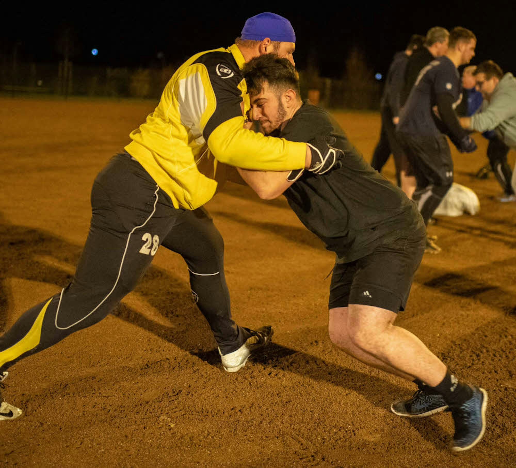 Während Höller den Fokus auf Schnelligkeit und Ausdauer legt, setzt Mannschaftskollege Miguel Menge andere Schwerpunkte. „Er trainiert alle Spieler, die ihre T-Shirts mindestens in XL tragen“, erklärt Höller. Menge bringt den „schweren Jungs“ die Grundlagen beim Tackeln (engl. in Angriff nehmen) bei. Bei dem körperlichen Angriff geht es darum, den Gegner aufzuhalten oder im Idealfall den Ballträger zu Boden zu bringen. Immer wieder prallen 100 Kilo und mehr aufeinander. Das Gesicht verzieht dabei niemand – die Blöße möchte sich keiner geben.