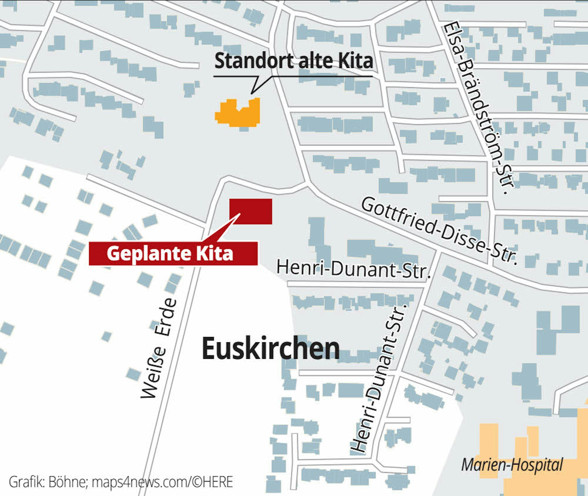 Was die Einrichtung an der Straße Weiße Erde anbelangt, die für rund 100 Kinder konzipiert wird, muss die Stadt vor allem die verkehrliche Situation unter die Lupe nehmen. Nach Ansicht der Verwaltung liegt der Standort nicht optimal, zumal sich ganz in der Nähe bereits zwei Kindertageseinrichtungen mit insgesamt acht Gruppen befinden, sodass es vor allem für die üblichen Bringzeiten am Morgen mit einer spürbar höheren Belastung in der Straße Weiße Erde und in der Gottfried-Disse-Straße zu rechnen ist. Manfred van Bahlen (FDP) wies darauf hin, dass außerdem „gegenüber dem geplanten Kita-Standort ein Wohn- und Geschäftshaus entsteht, das ebenfalls für zusätzlichen Verkehr sorgen wird“.