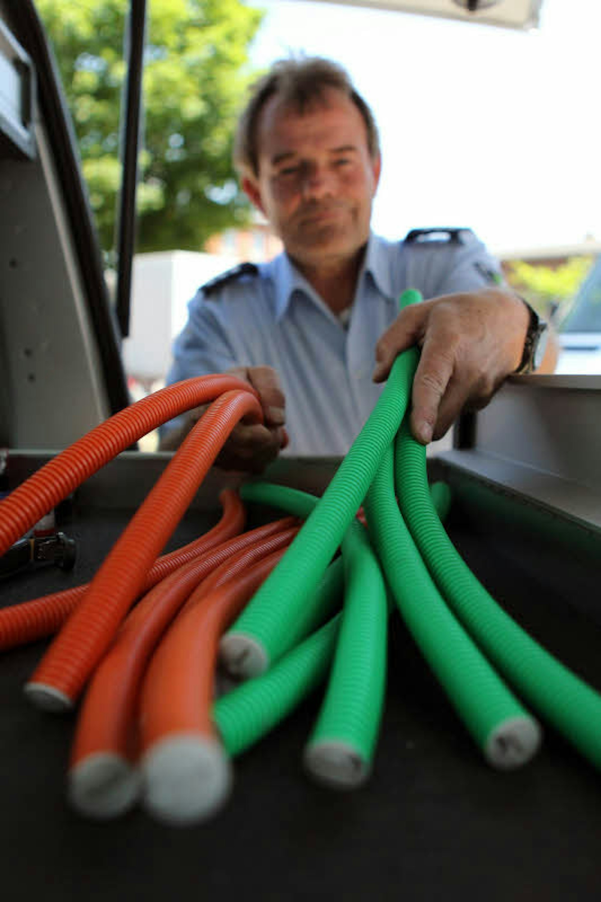 Wenn’s trocken ist, funktioniert die Sprühfarbe einwandfrei. Bei stärkerem Regen, Eis und Schnee hält sie jedoch nicht oder verläuft. Die Euskirchener hatten die pfiffige Idee, kurze, farbige Plastikleerrohre mit Sand zu füllen und damit die Markierungen vorzunehmen. Auch die gute, alte Kreide haben die Polizisten in ihrem Fahrzeug an Bord.