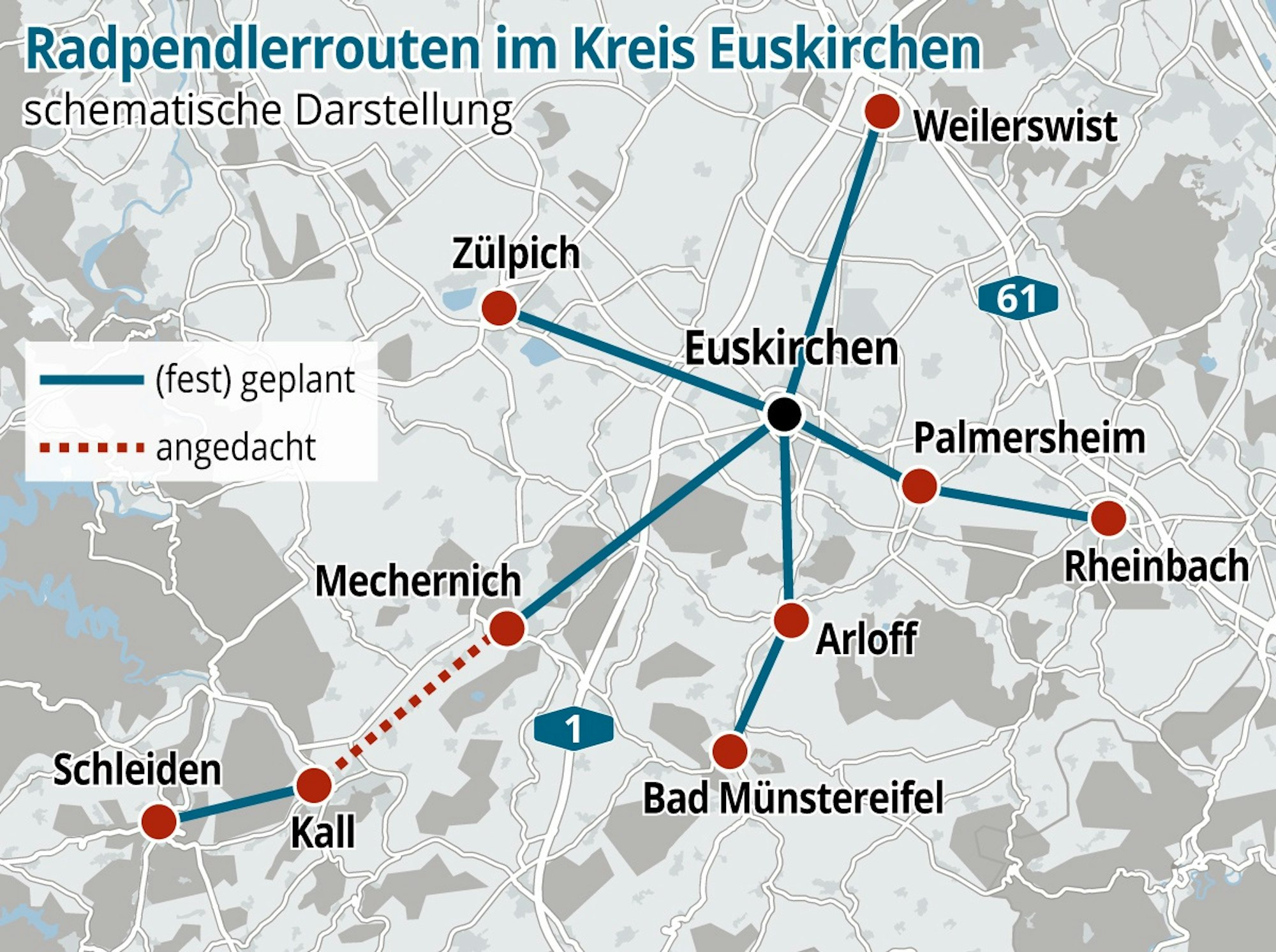 210 Kilometer Straßen- und Radwegenetz haben die Experten des Kreises, der Kommunen und des Planungsbüros VIA unter die Lupe genommen. Als Radpendlerrouten haben sich die Strecken Euskirchen-Weilerswist, Euskirchen-Bad Münstereifel, Euskirchen-Zülpich, Euskirchen-Mechernich und Schleiden-Gemünd-Kall ergeben.