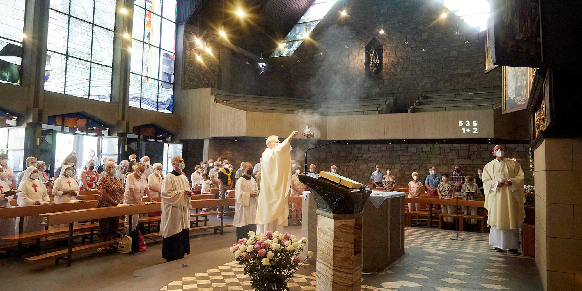 Bis zum Abend kommen zwölf Pilgergruppen mit insgesamt rund 350 Menschen nach Heimbach. Sie werden vom Aachener Dompropst Rolf-Peter Cremer begrüßt, der den Eröffnungsgottesdienst zelebriert. Der Sistiger ist als Jugendlicher oft bei der Wallfahrt mitgegangen, damals noch in die alte Kirche. „Dies ist ein schönes Glaubensfest, dass man unserer Kirche gar nicht mehr zutraut“, begrüßt er die Gläubigen im Gottesdienst. Seine Predigt stellt er unter das Thema Begegnung. Eine Gelegenheit für ihn, das Thema Missbrauch anzusprechen. Es sei deutlich geworden, das in der Prävention zu viel Nähe bei Kindern oder Abhängigen nachteilig sein könne. Die Tiefe der Begegnung mit dem Gnadenbild könne man oft nicht erklären. Es sei ein Moment, wo Himmel und Erde sich berührten.