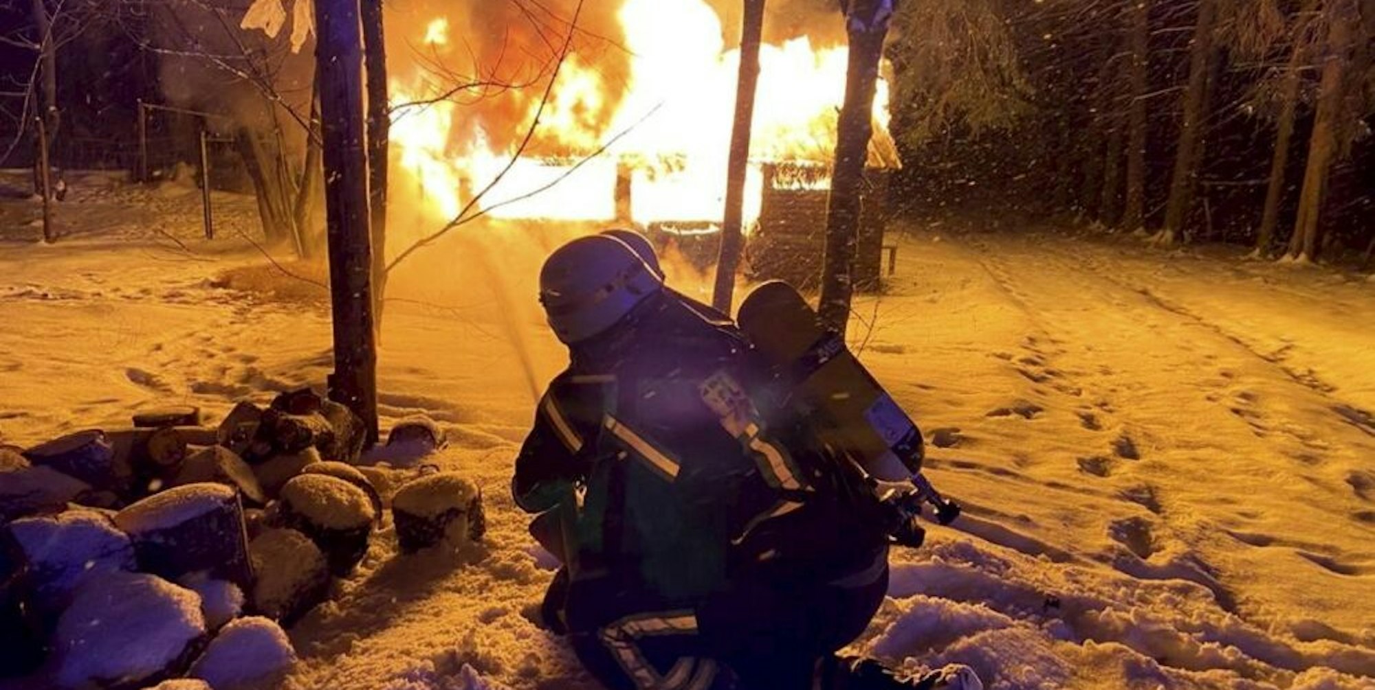 In sicherer Entfernung im Schnee knieend, bekämpften die Feuerwehrleute den Brand des Blockhauses , da darin Gasflaschen gelagert waren.