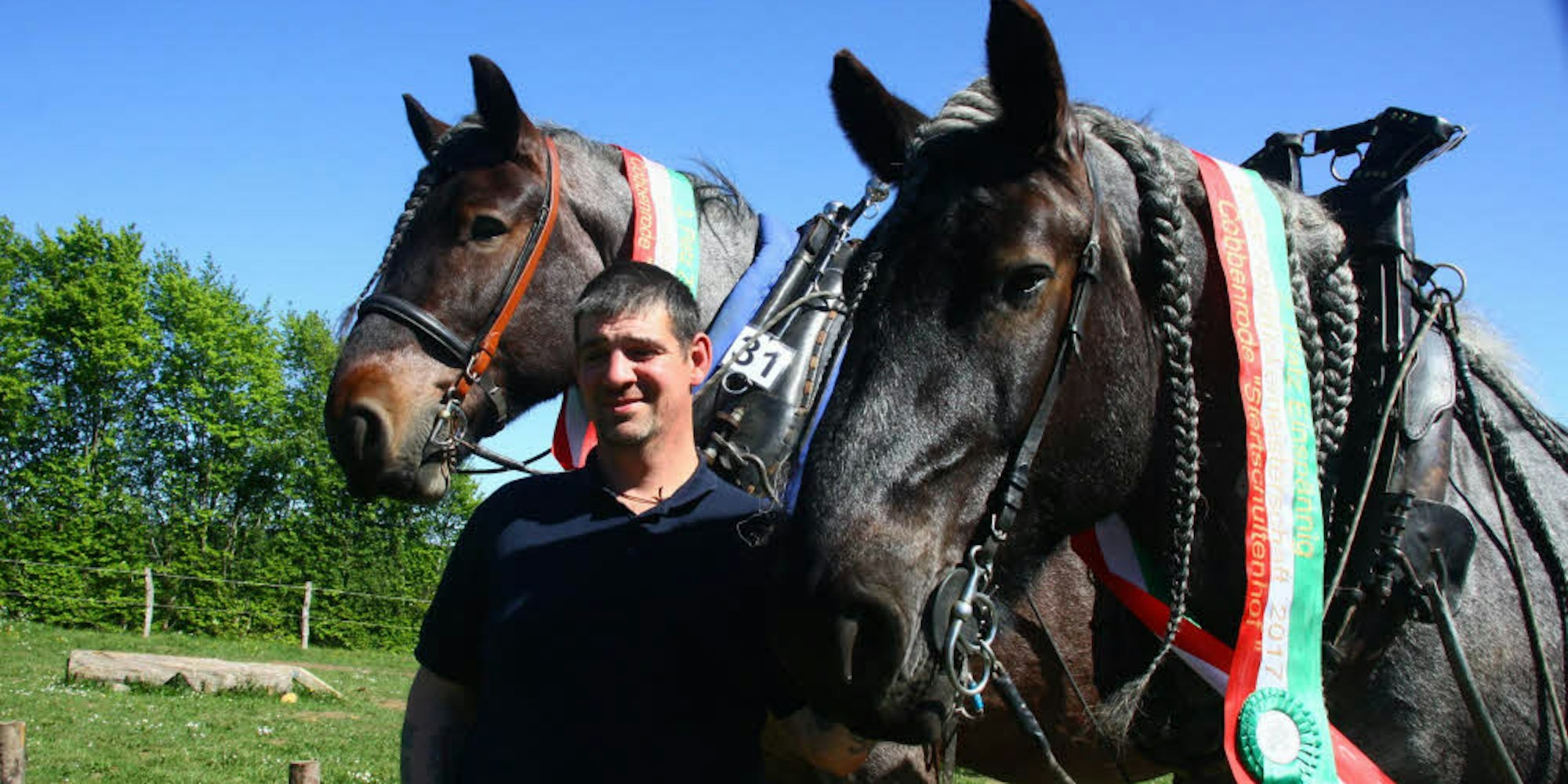 Udenbreth – Reich dekoriert ist Dirk Zöll mit seinen Pferden „Wotan“ und „Rocky“ von den NRW-Meisterschaften in Cobbenrode in die Eifel zurückgekehrt. Sowohl im einspännigen als auch im zweispännigen Holzrücken konnte er den Titel des NRW-Meisters erringen. Die Freude darüber war groß, denn im Vorfeld musste Zöll sich mit Schwierigkeiten herumschlagen.