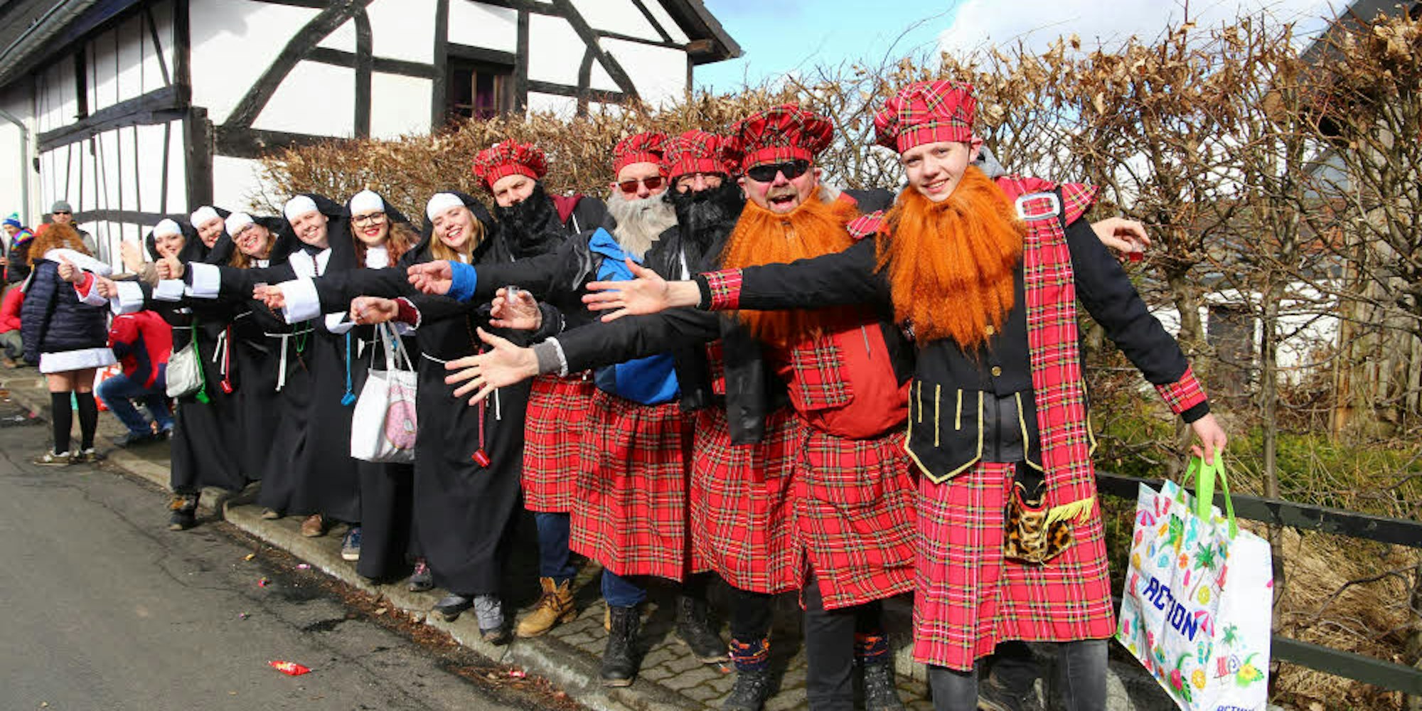 Ihren Urlaub in der Karnevalshochburg Hecken verbringen diese Nonnen und Schotten aus Antwerpen, die am Zugweg feierten.