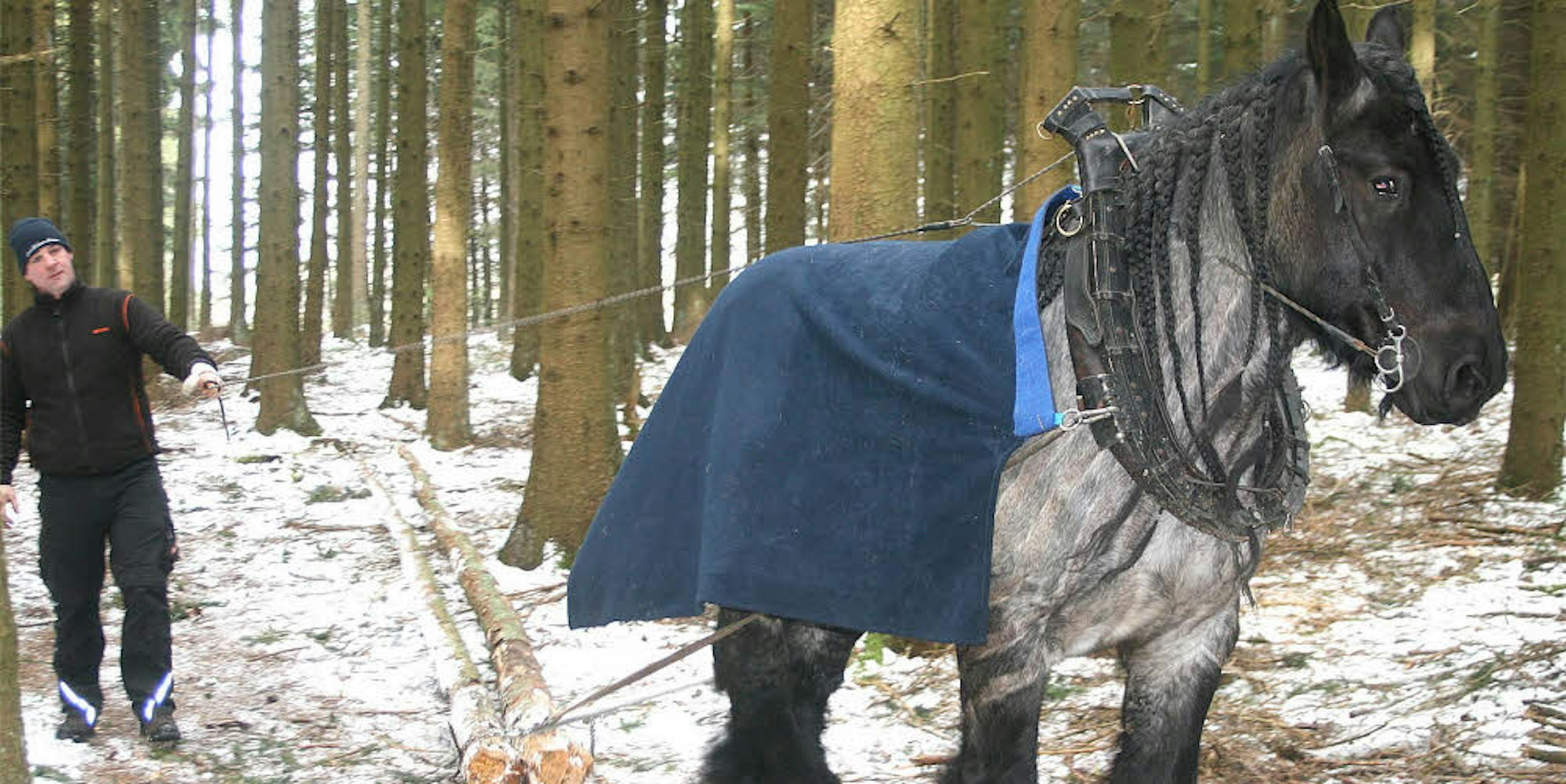 Irco setzt sich auf Kommando locker in Bewegung. Er hat zwei eher dünne Fichtenstämme hinter sich – eine leichte Übung für den acht Jahre alten Wallach. 850 Kilogramm Lebendgewicht hat das Belgische Zugpferd, in Insiderkreisen ist die Rasse als „Blauer Belgier“ bekannt. Die beiden Stämme an der Kette hinter ihm, vertäut an einer Eisenstange und am Zuggeschirr befestigt, sind für Irco eher ein Spielzeug. Über das Kummet oder einen anderen Brustschild wird die schier unbändige Kraft des Kaltblüters auf das Zuggespann geleitet. „Der kann bis zu 1,2 Tonnen ziehen“, stellt Dirk Zöll nüchtern fest, während er an der Langleine hinter seinem Holzrückepferd geht.