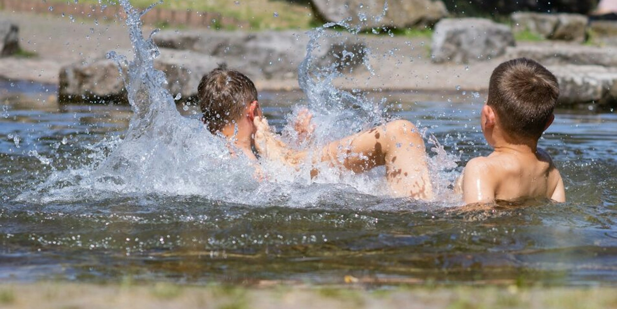 Eine Möglichkeit, den bisher heißesten Tag des Jahres erträglich zu gestalten: der Wasserspielplatz an der Erftaue.