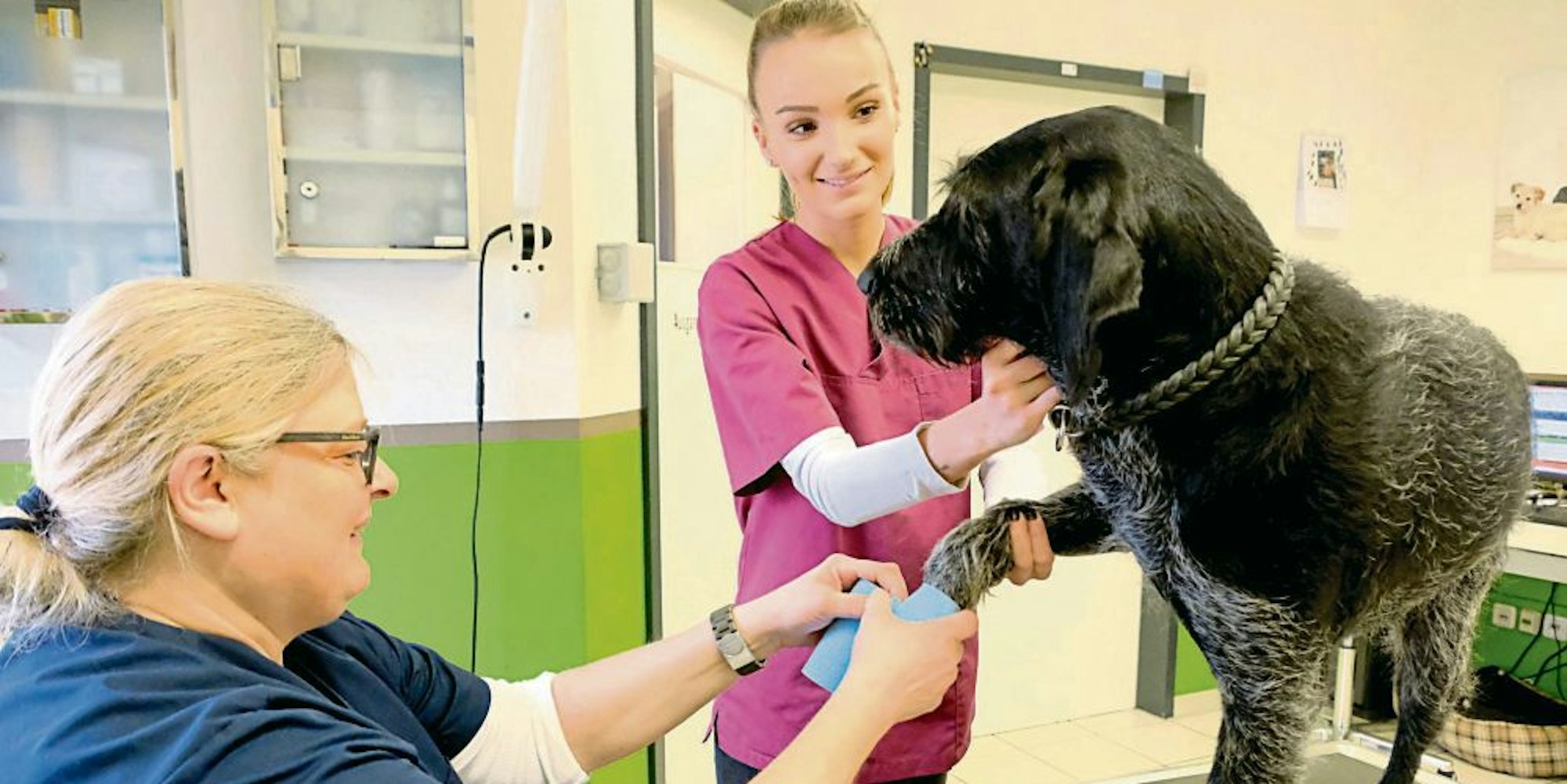 Tierärztin Elfi Kannengießer (l.) und Tierarzthelferin Madita Schuberth versorgen eine Verletzung an Emils Pfote.