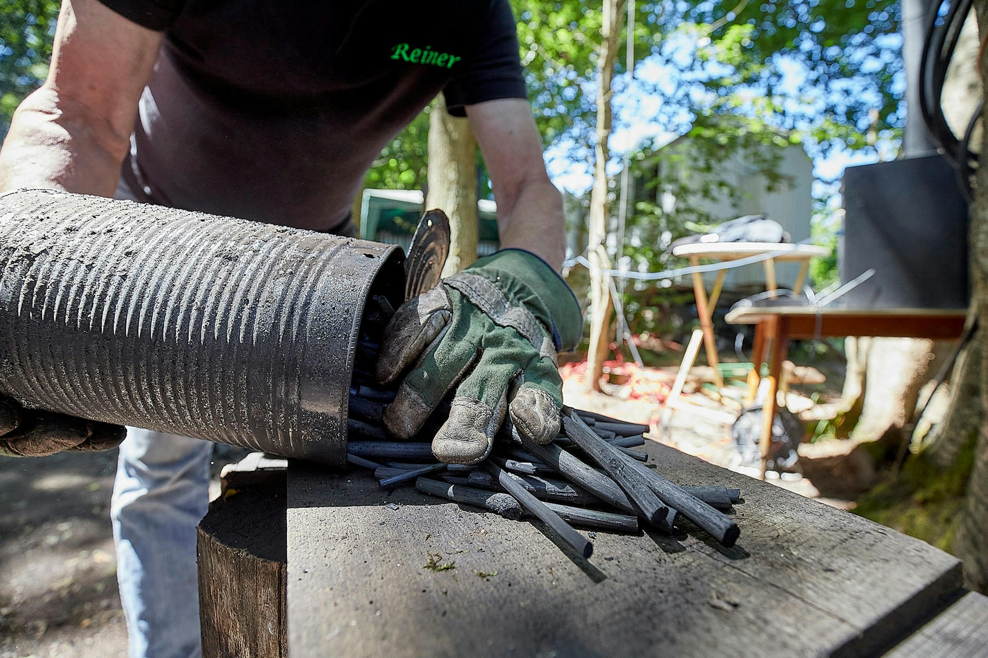 In einer Dose werden Holzstäbe zu Zeichenkohle verarbeitet.