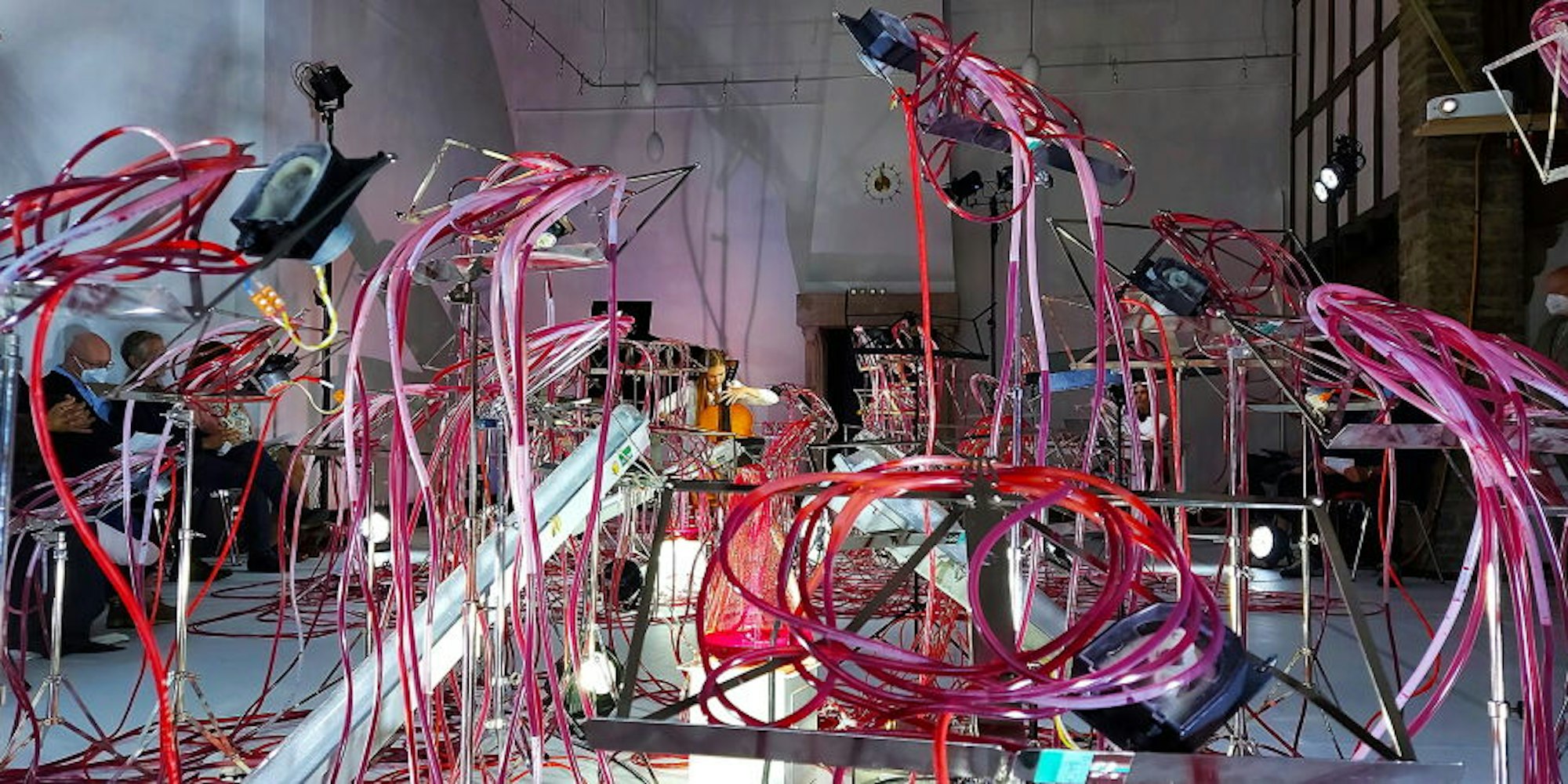 Knäuel aus mit roter Flüssigkeit gefüllten Schläuchen umgeben die Cellistin Valerie Fritz bei „Nuqta – The beginning“.