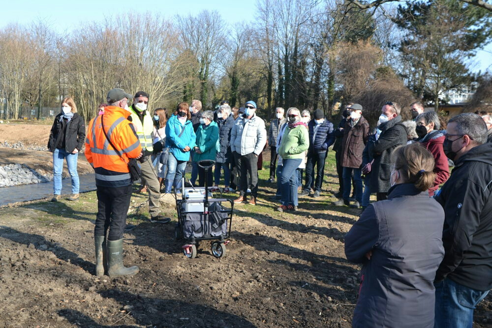 „Die Berechnungen erwiesen sich als kompliziert, weil die Erft seit dem Mittelalter für den Betrieb von Mühlen genutzt wurde“, erklärte Gimmler im Rahmen einer Baustellenführung, die der Erftverband in Kooperation mit der Stadt nun angeboten hat. Fest stehe jedoch, dass der Fluss einst etwa die doppelte Länge des Tales maß, durch das er fließt. Seit Projektbeginn, das im Jahr 2000 durch eine neue europäische Wasserrahmenrichtlinie angestoßen und nach Planungsbeginn 2020 durch die Kreisstadt genehmigt wurde, hat sich der Flusslauf zwischen der Kölner Straße und der Straße „Am Marienpütz“ um 600 Meter auf 1,6 Kilometer verlängert. Neben dem ökologischen Nutzen sind spätestens seit der Flut auch viele Fragen unter Anwohnern laut geworden, die bei der Führung über die Baustelle beantwortet werden sollten.