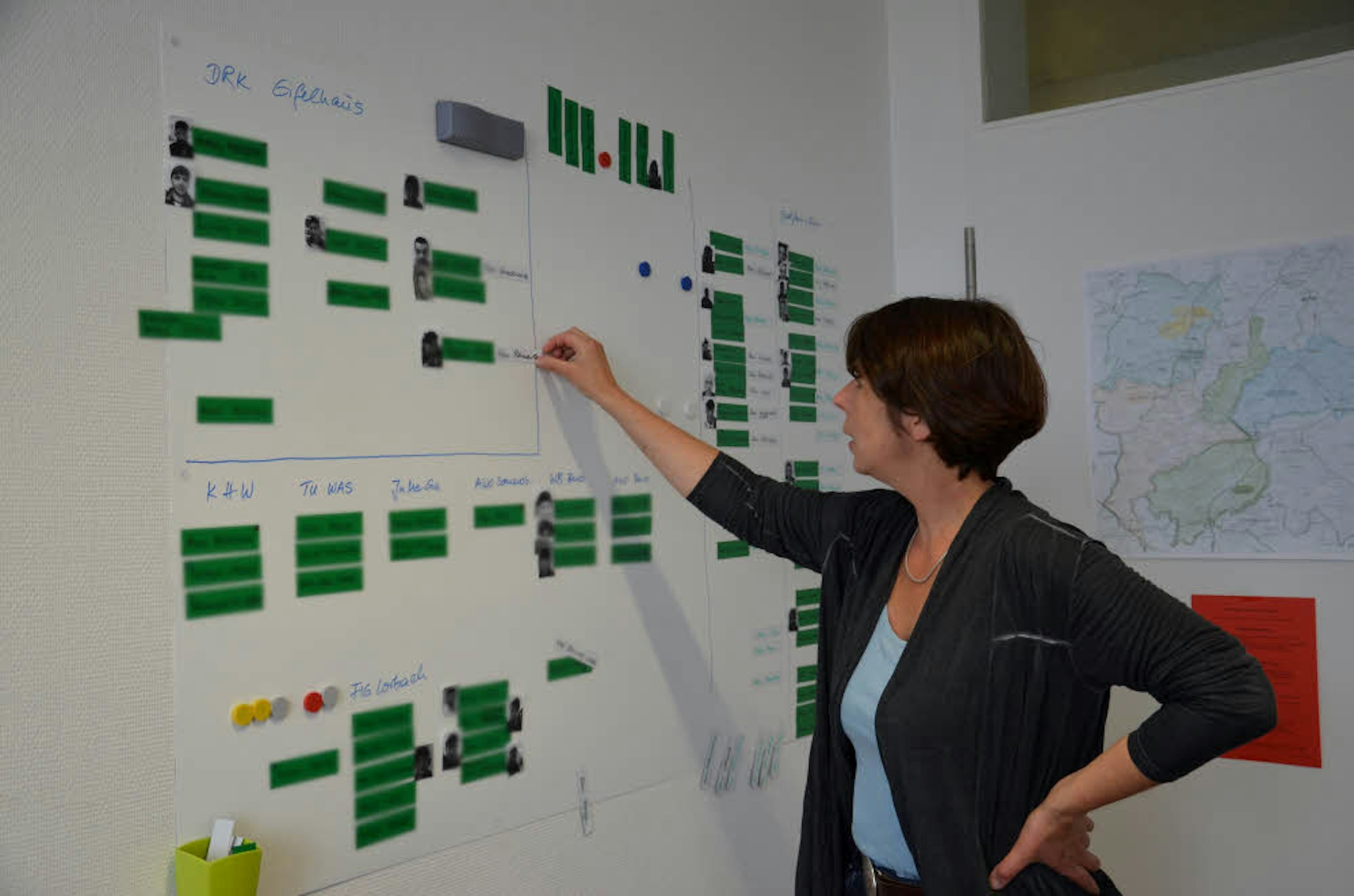 Petra Quast vor ihrem „Matching Board“, wo alle minderjährigen unbegleiteten Flüchtlinge sowie die Unterbringungsmöglichkeiten aufgeführt sind.
