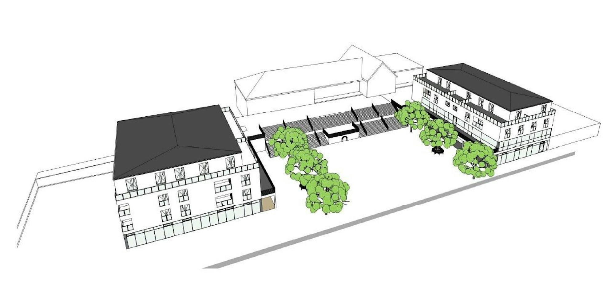 Die Planung sei schon weit gediehen: „Das Haus Nord ist fertig, beim Haus Süd gibt es noch etwas Abstimmungsbedarf.“ Das Haus Nord soll auf einem 1100 Quadratmeter großen Grundstück errichtet werden. Im Erdgeschoss und in der ersten Etage sollen Gewerbeflächen entstehen, in der zweiten Etage und im Staffelgeschoss Wohnungen. Parkplätze sind in dem Bereich zwischen dem Haus und dem Anbau an das Rathaus geplant.