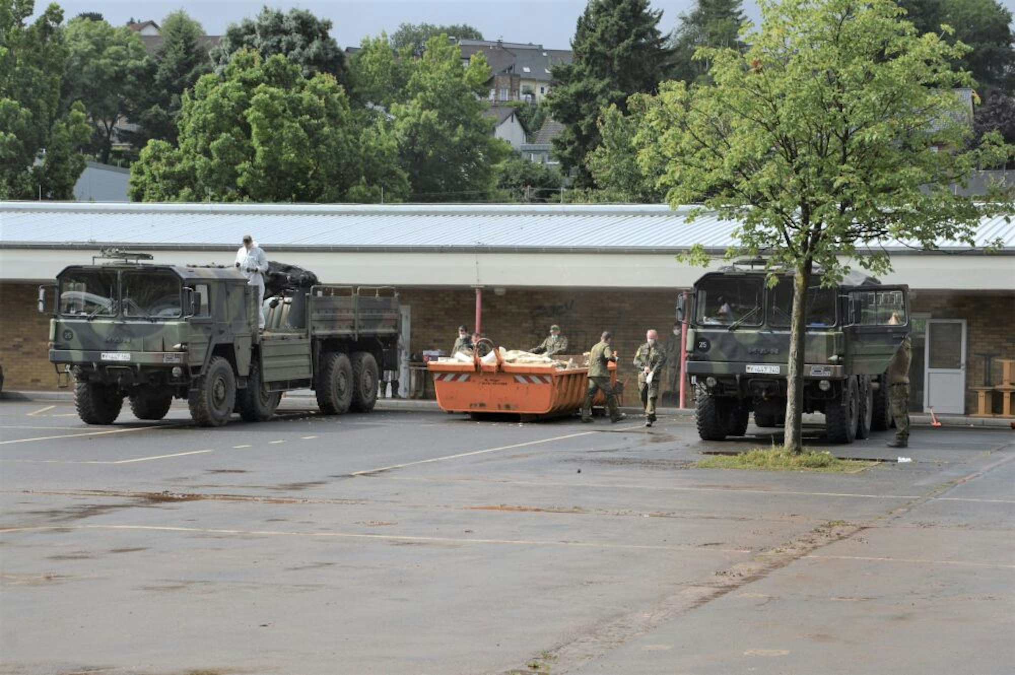 Bei den Aufräumarbeiten in der Gemeinde, hier an der neuen Grundschule in Kall, wurde auch die Bundeswehr eingesetzt.