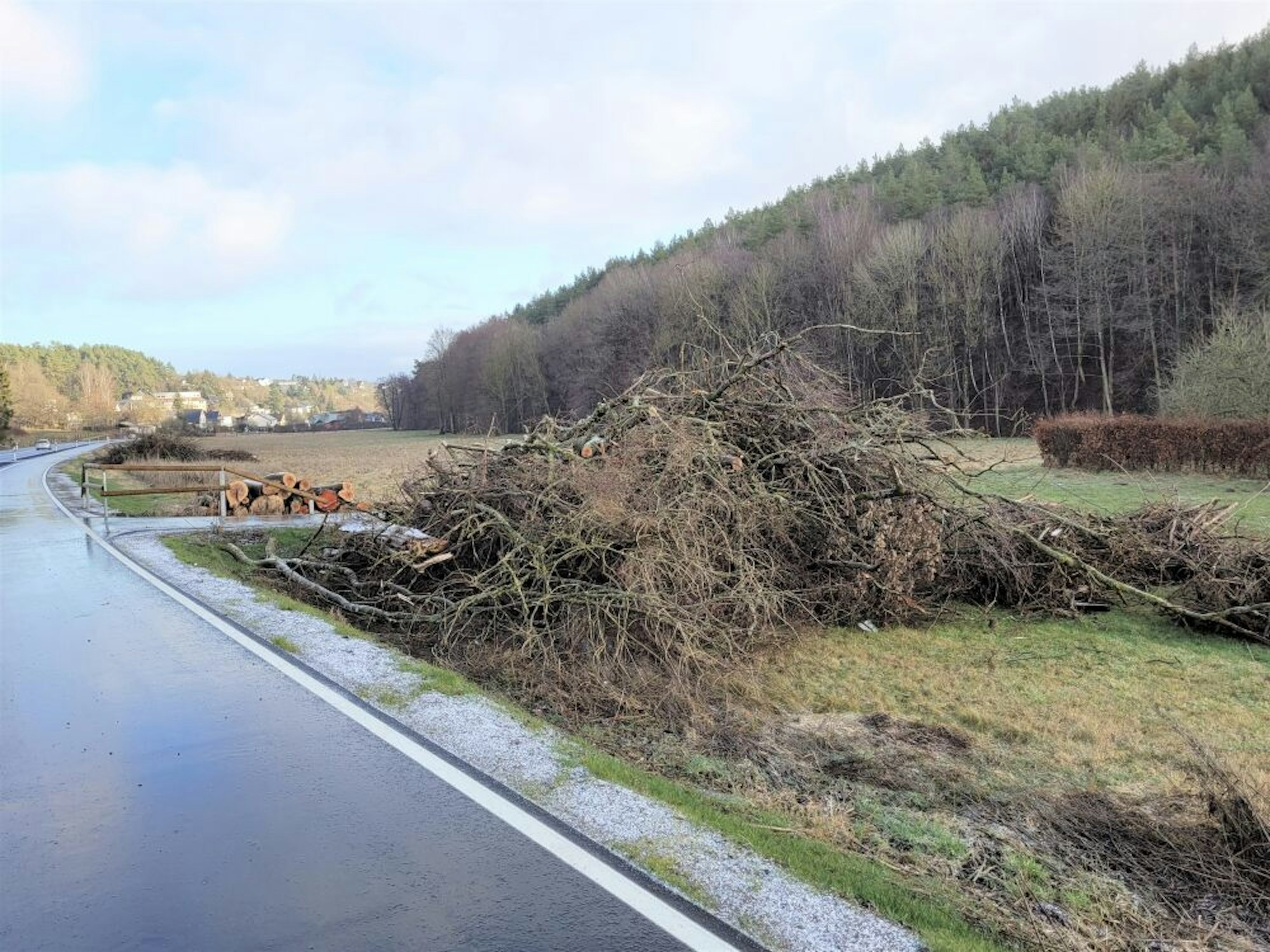 Abgemachte Bäume und Äste von den Ufern des Kallbachs werden derzeit an der Aachener Straße zwischen Kall und Golbach gelagert.
