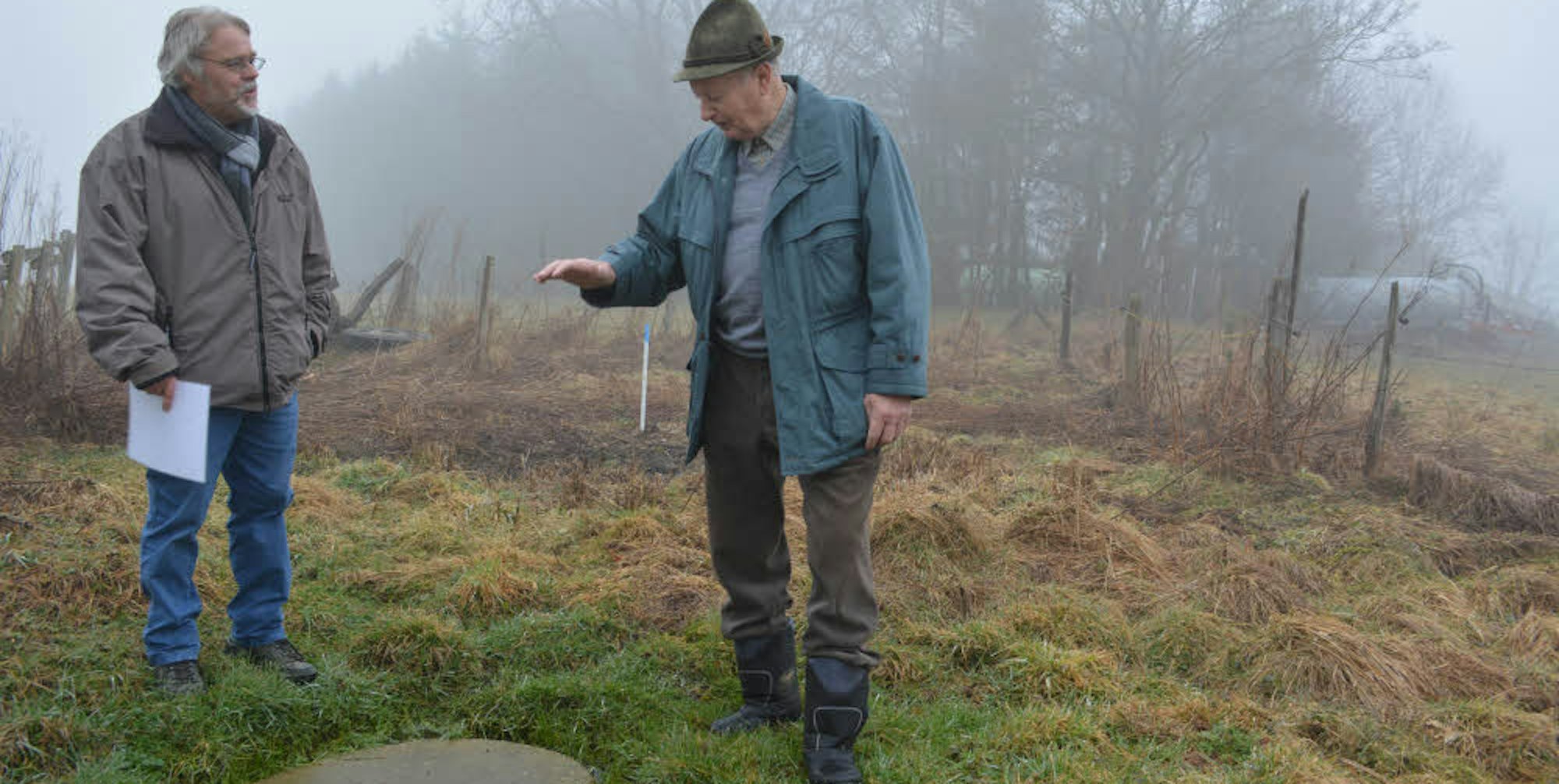 Historisch bedeutsam sei der zugewachsene Weg in Frohnrath, meinen Willi Cremer (r.) und Ekkehard Fiebrich.