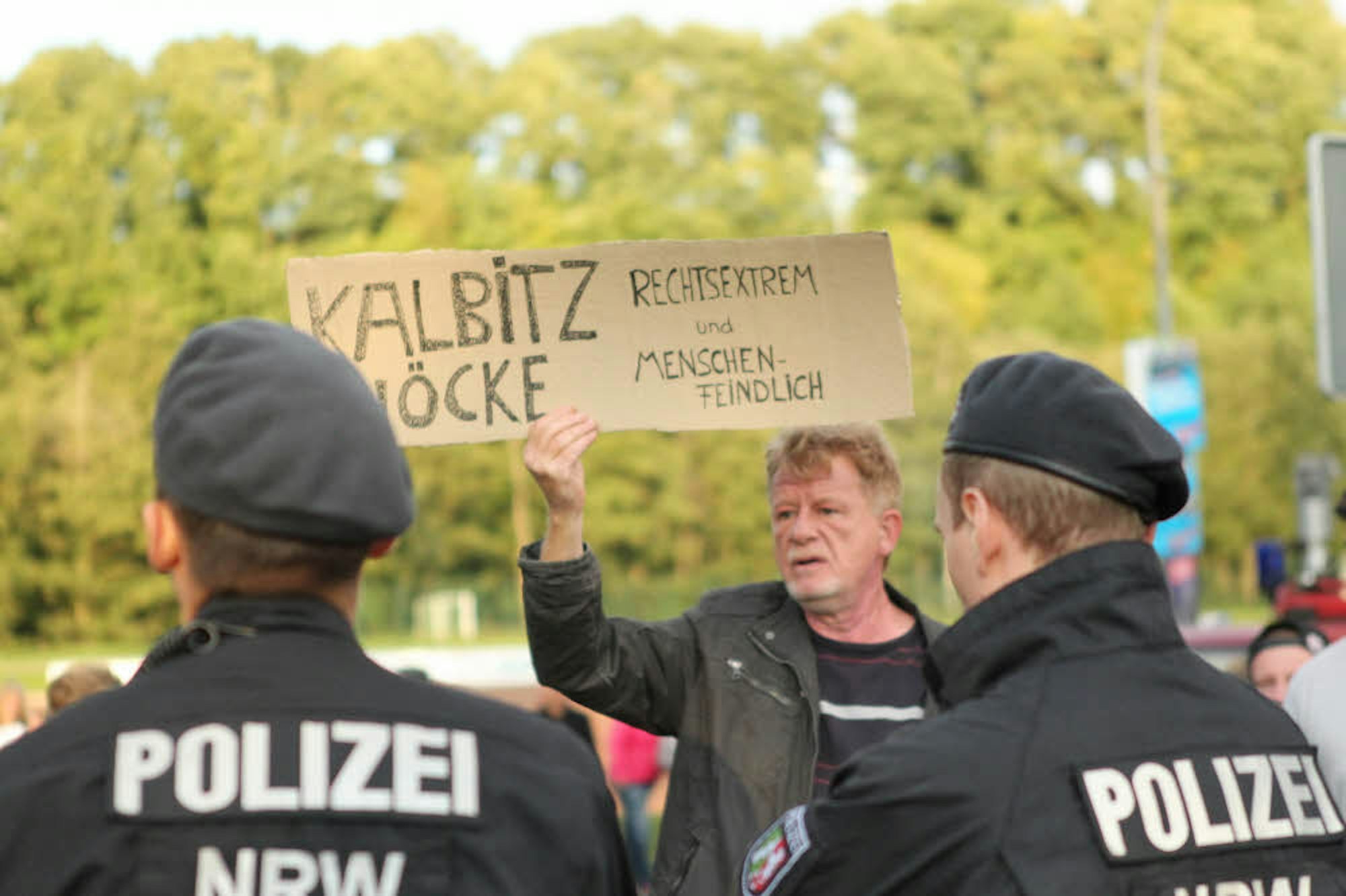 Kall – Hunderte Menschen könnte der Schulhof der Hauptschule locker fassen. Doch so viele kamen am Dienstagabend längst nicht zur AfD-Wahlkampfveranstaltung nach Kall. Knapp 70 waren es nach Angaben von Polizei-Sprecher Norbert Hardt, die sich die Reden des brandenburgischen Landesvorsitzenden Andreas Kalbitz, des NRW-Spitzenkandidaten für die Bundestagswahl, Martin E. Renner, und des Kreis Euskirchener Kandidaten Rüdiger Lucassen anhören wollten. Genauso viele waren laut Polizei bei der Kundgebung, die das Bündnis Eifel gegen Rechts gegen die Veranstaltung initiiert hatte. Dazu kamen mehr als 50 Polizisten, auch von einer Einsatzhundertschaft aus Mönchengladbach, die keine Probleme mit der laut, aber friedlich verlaufenden Veranstaltung hatten.