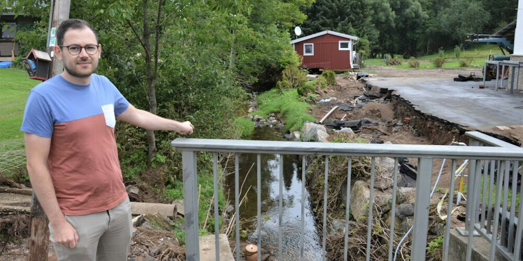 Emmanuel Kunz zeigt auf die Schäden, die der Kallbach an seinen Ufern hinterlassen hat.