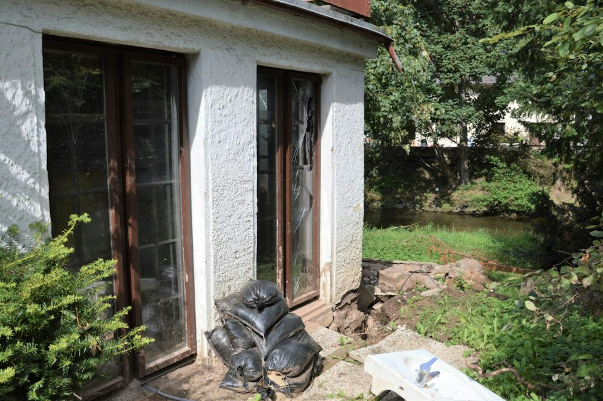 Scheiben gingen zu Bruch, die Sandsäcke konnten nicht mehr helfen. Im Hintergrund fließt jetzt friedlich die Urft.