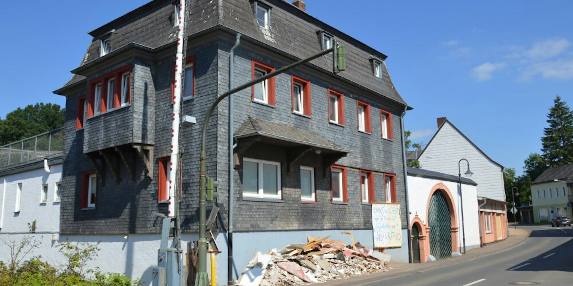 Vor dem Stammhaus des Kinder- und Jugendheims Haus Waltrud in der Aachener Straße in Kall liegt noch der Schutt.