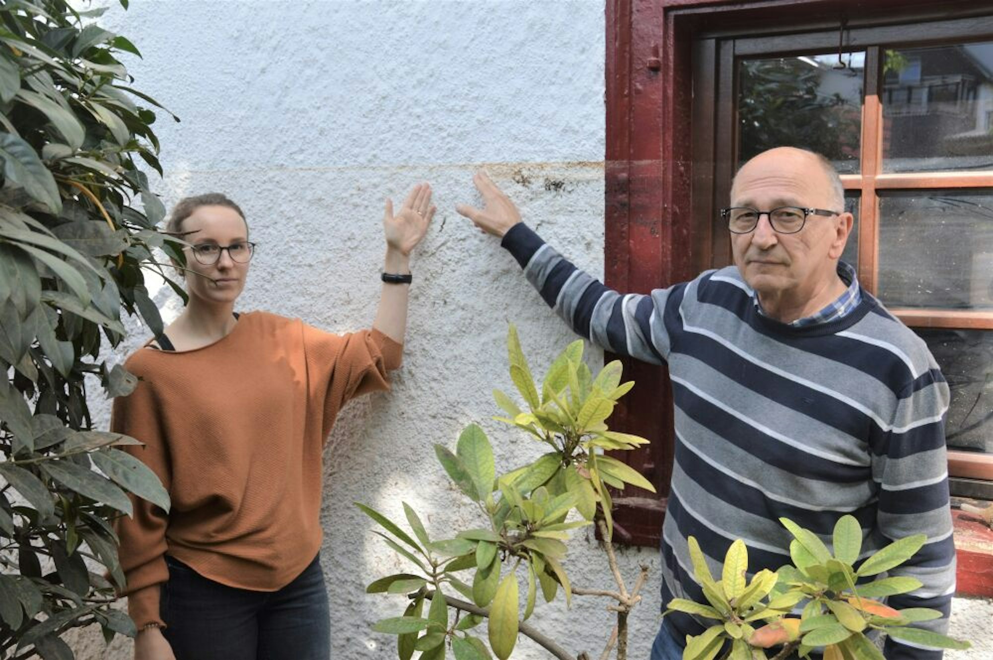 Wie hoch das Wasser in der Verwaltung in der Auelstraße stand, zeigen Mona Puschmann Zacharias und ihr Vater Helmut Puschmann.