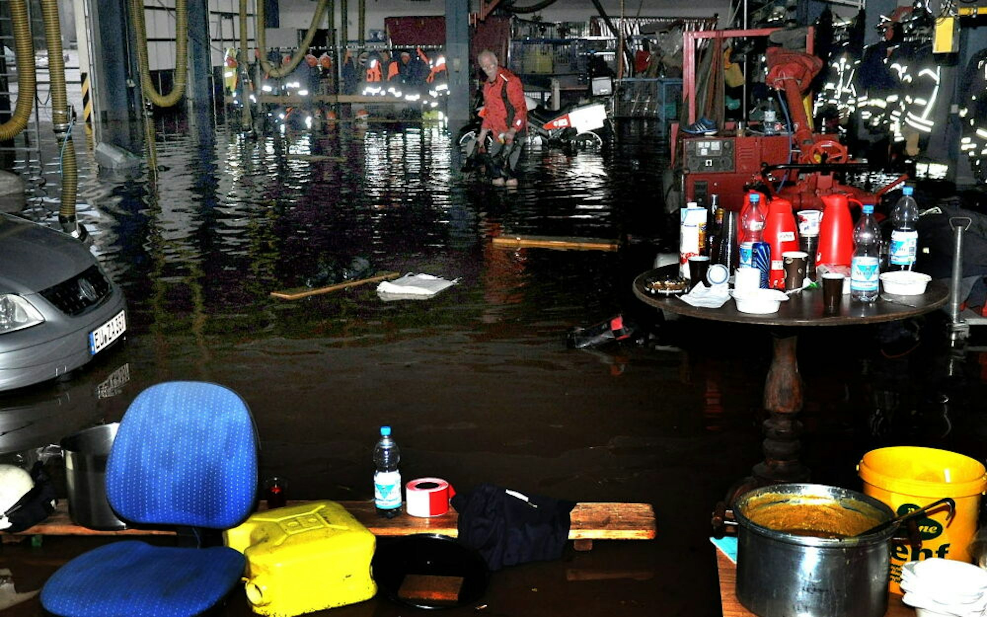 Eine weise Entscheidung, denn innerhalb kürzester Zeit stand die Feuerwache über zwei Meter hoch unter Wasser. Etwa 20 vor dem Gerätehaus abgestellte Fahrzeuge der Einsatzkräfte versanken im Hochwasser oder wurden weggespült. Ein Anhänger der Feuerwehr wurde erst zwei Tage später auf einem Dach an der Bahnhofstraße wiedergefunden.
