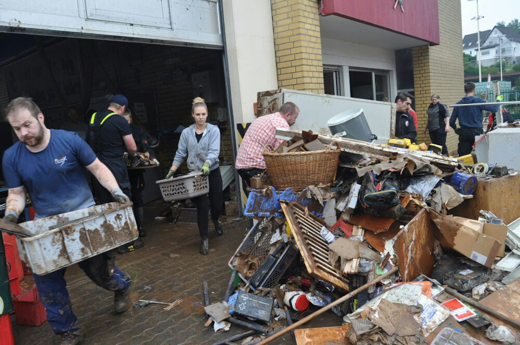 Nach der Katastrophe ist auch in Kall die Hilfsbereitschaft groß. Nicht nur die Kaller packen mit an, wo eben Hilfe gefragt ist. Auch aus den höher gelegenen und damit kaum betroffenen Orten kommen die Menschen und helfen. Es werden keine langen Einsatzpläne geschrieben, man fragt und legt los. Etwa 30 Freiwillige waren es alleine, die die Feuerwehr beim Entrümpeln und Reinigen des Gerätehauses unterstützten. Löschzugführer Daniel Rütz war berührt von der großen Hilfe, die geleistet wird.